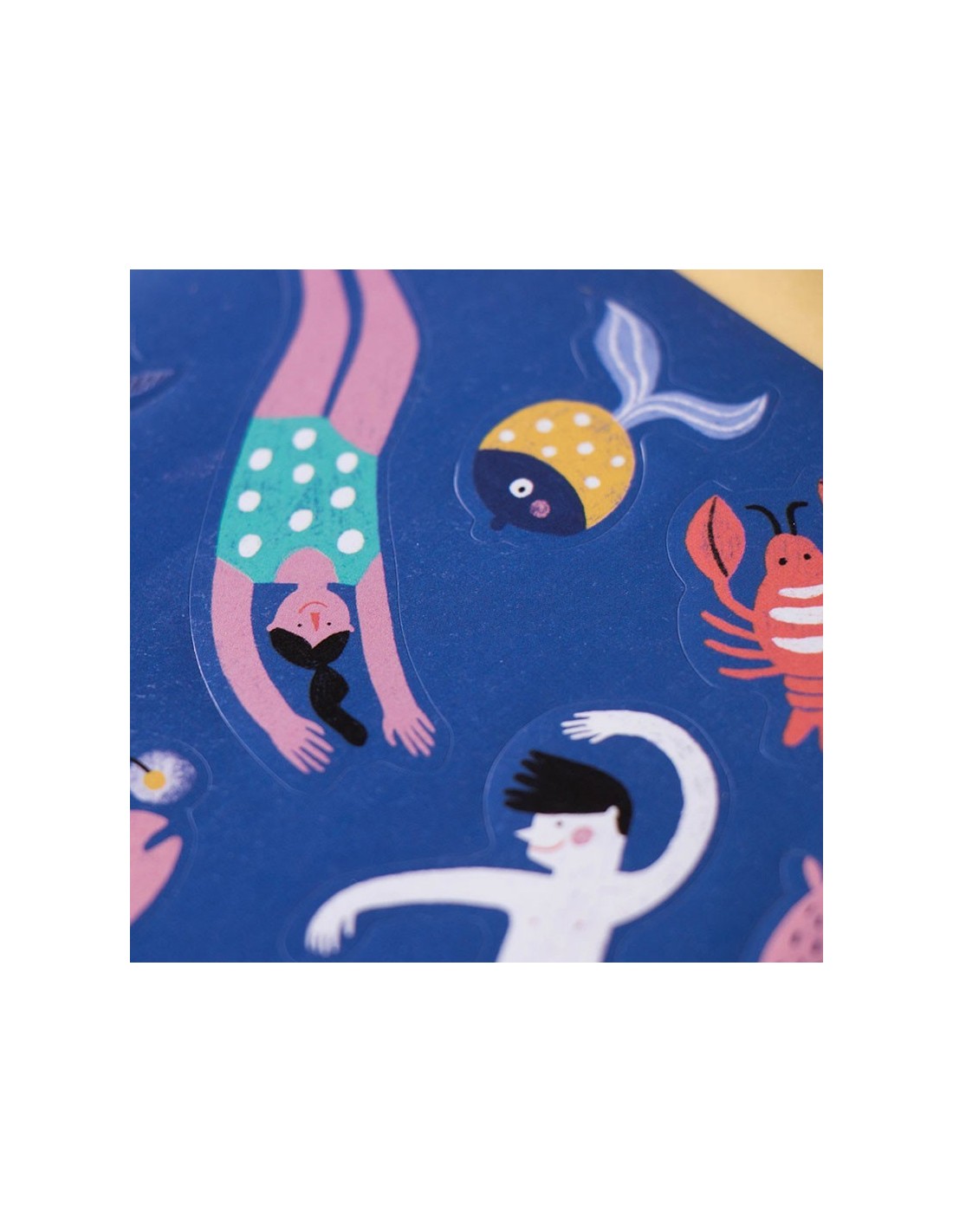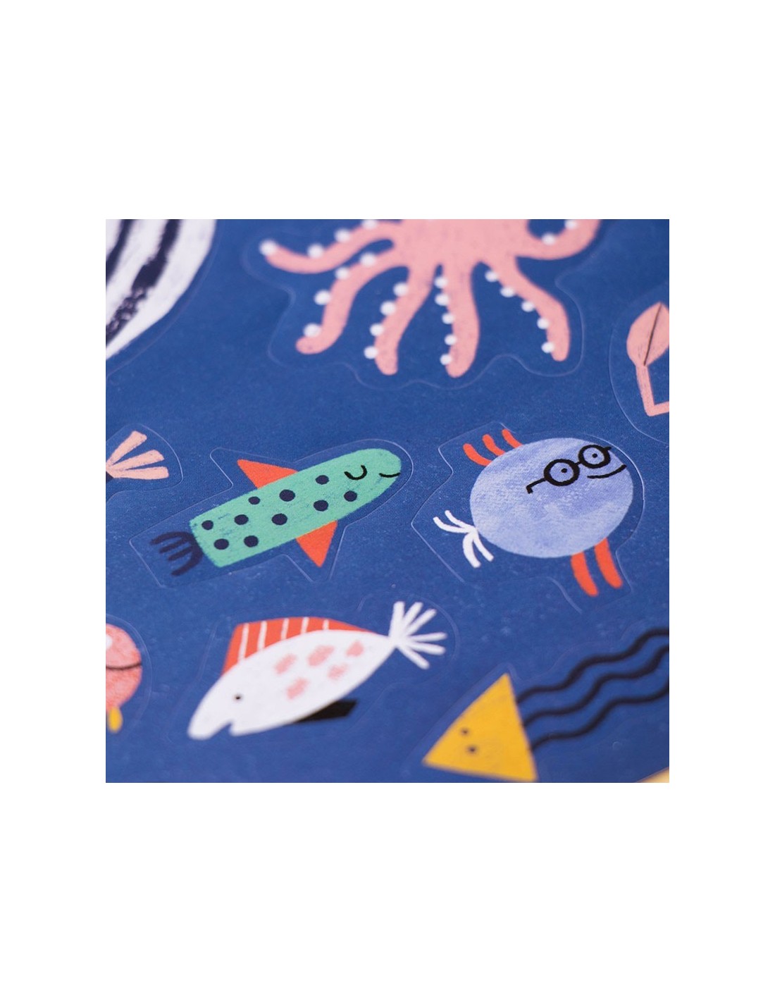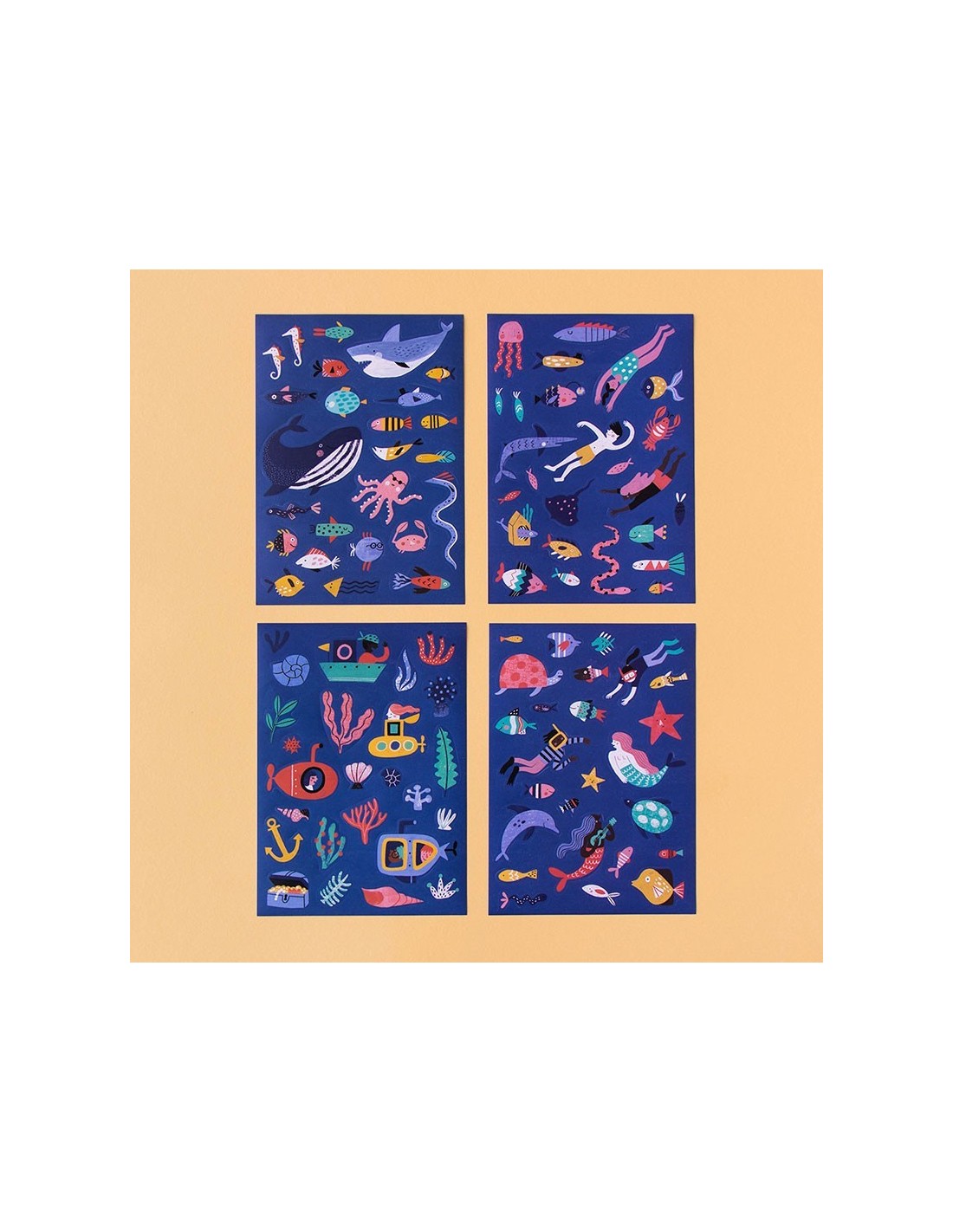 ¡Un juego de 150 pegatinas removibles marinas con algas, peces, sirenas y submarinistas para que construyas el fondo marino de tus sueños sobre tu escenario preferido!