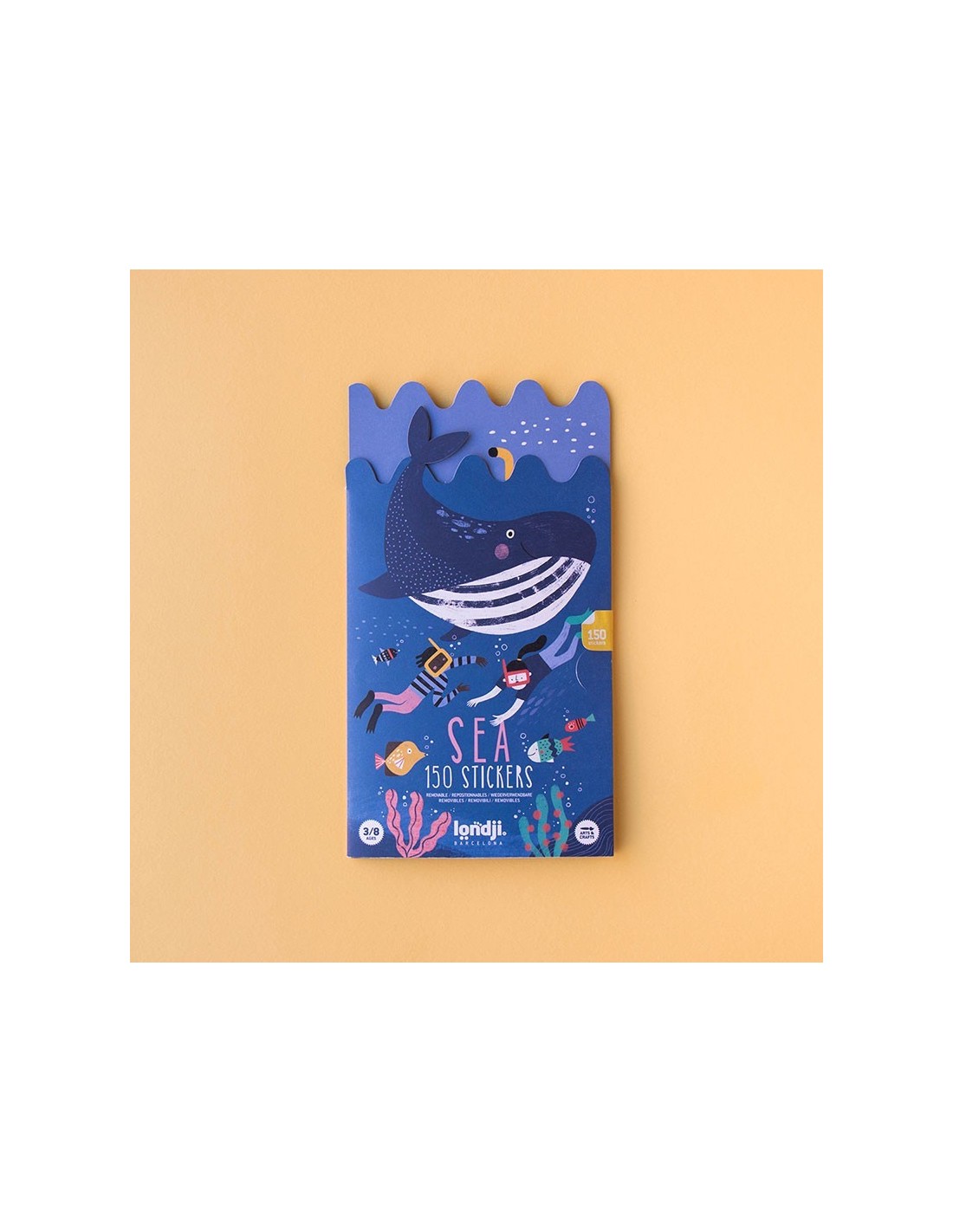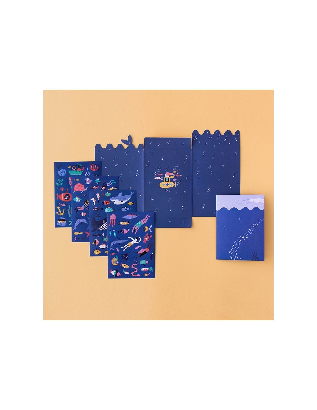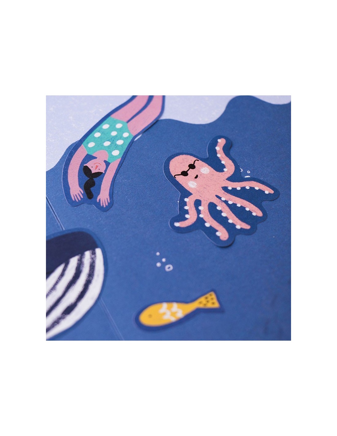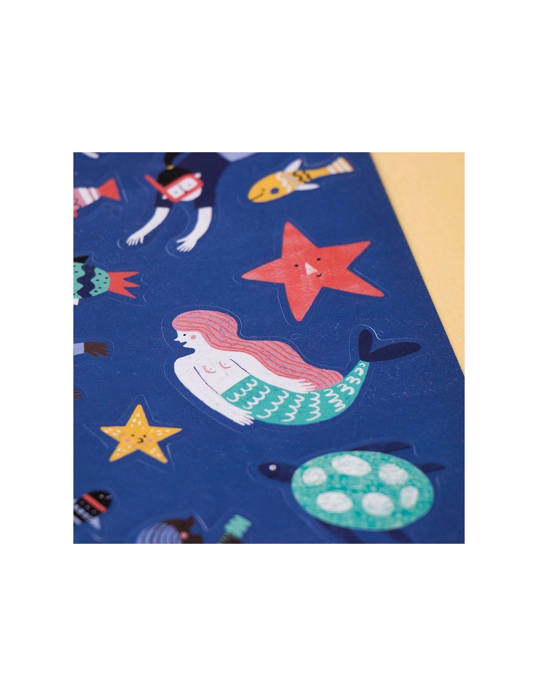 ¡Un juego de 150 pegatinas removibles marinas con algas, peces, sirenas y submarinistas para que construyas el fondo marino de tus sueños sobre tu escenario preferido!