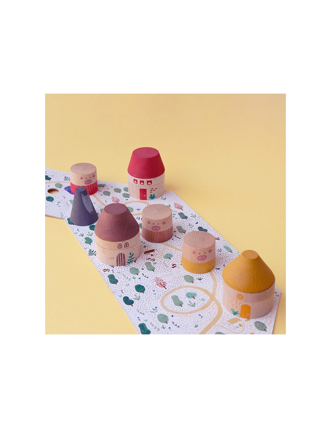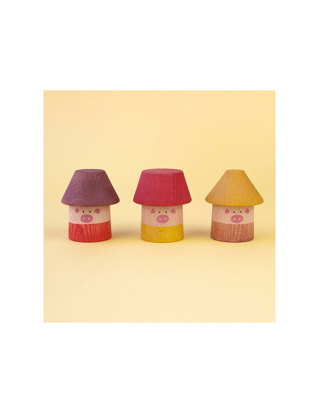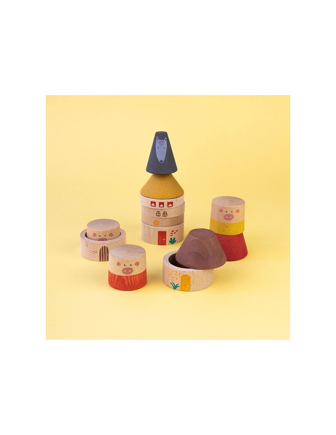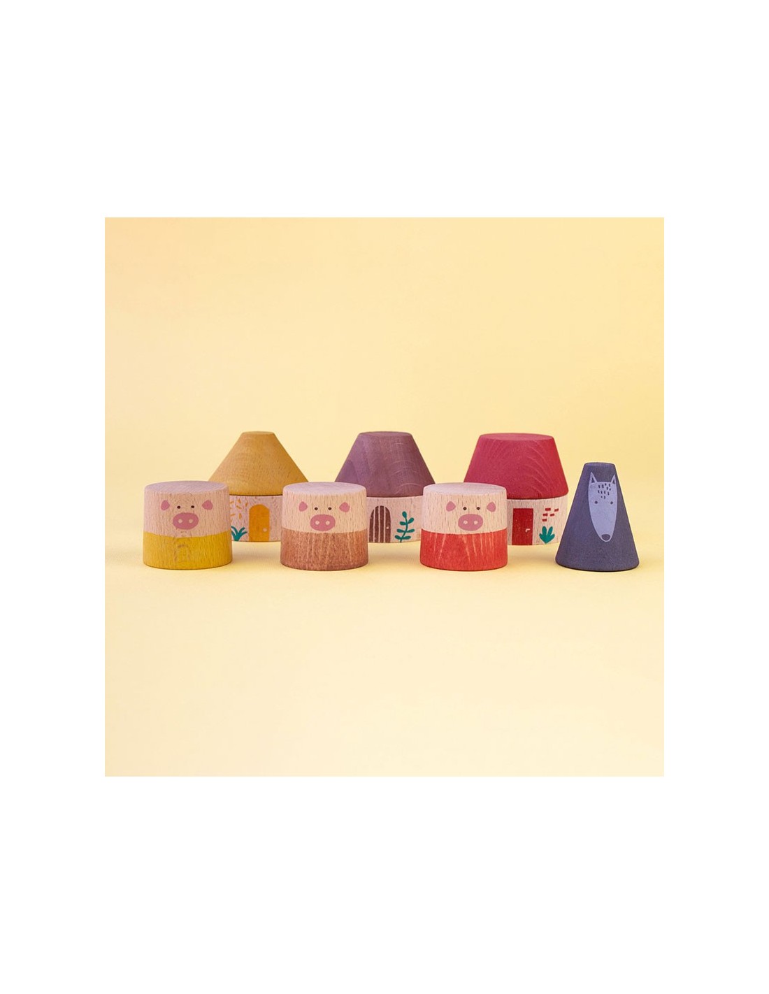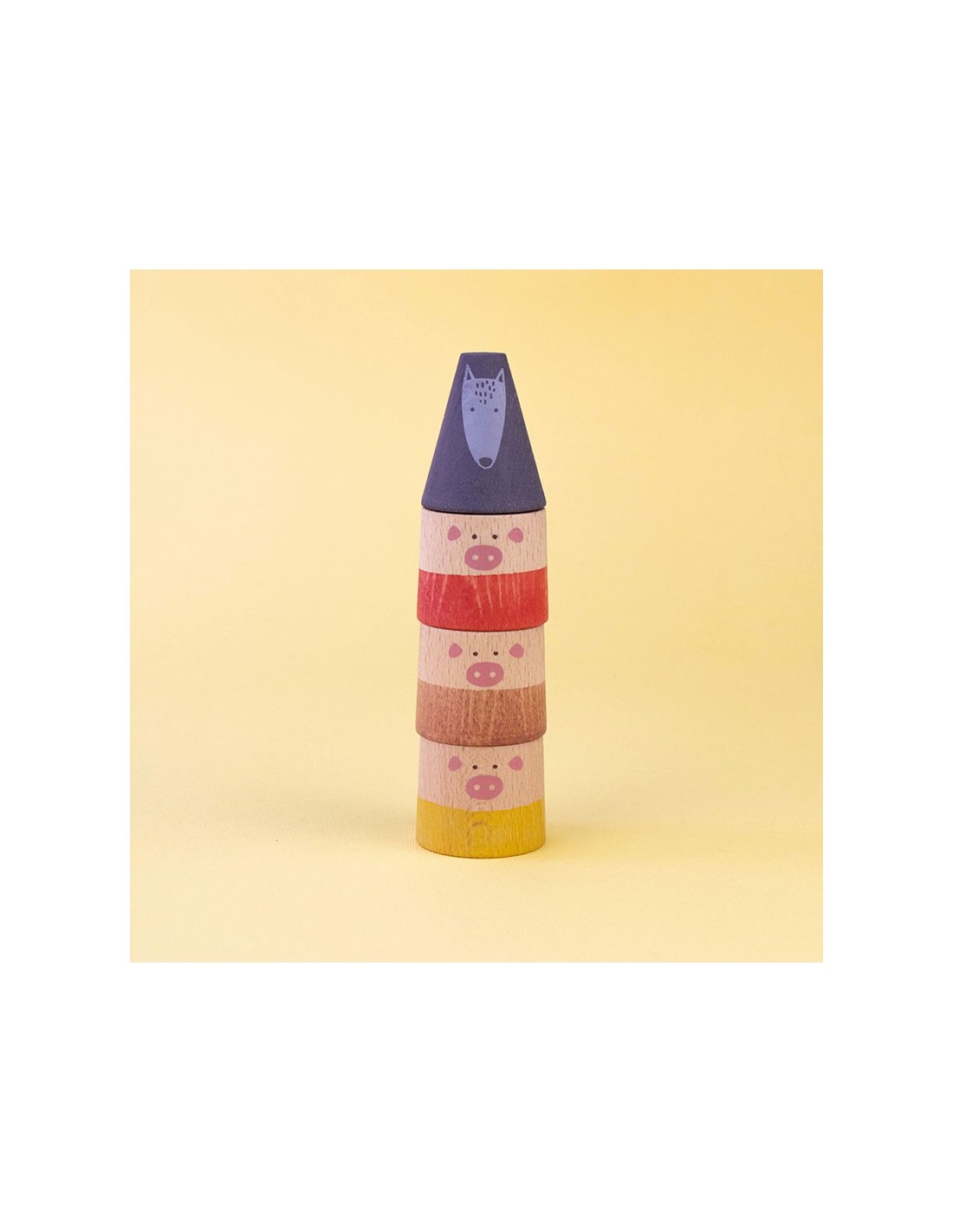 Un juguete de madera de los tres cerditos para apilar, encajar y contar historias. Juguete responsable y de proximidad. Diseñado y fabricado en Barcelona.![]()