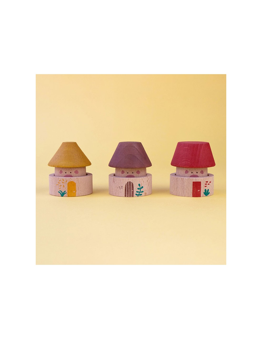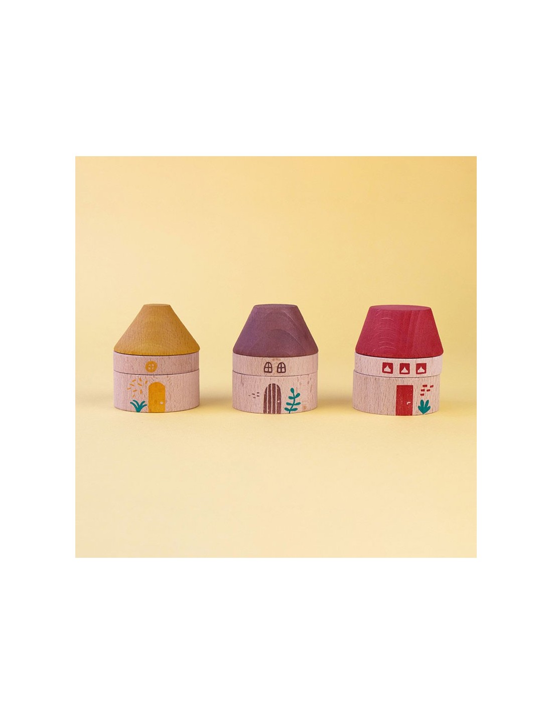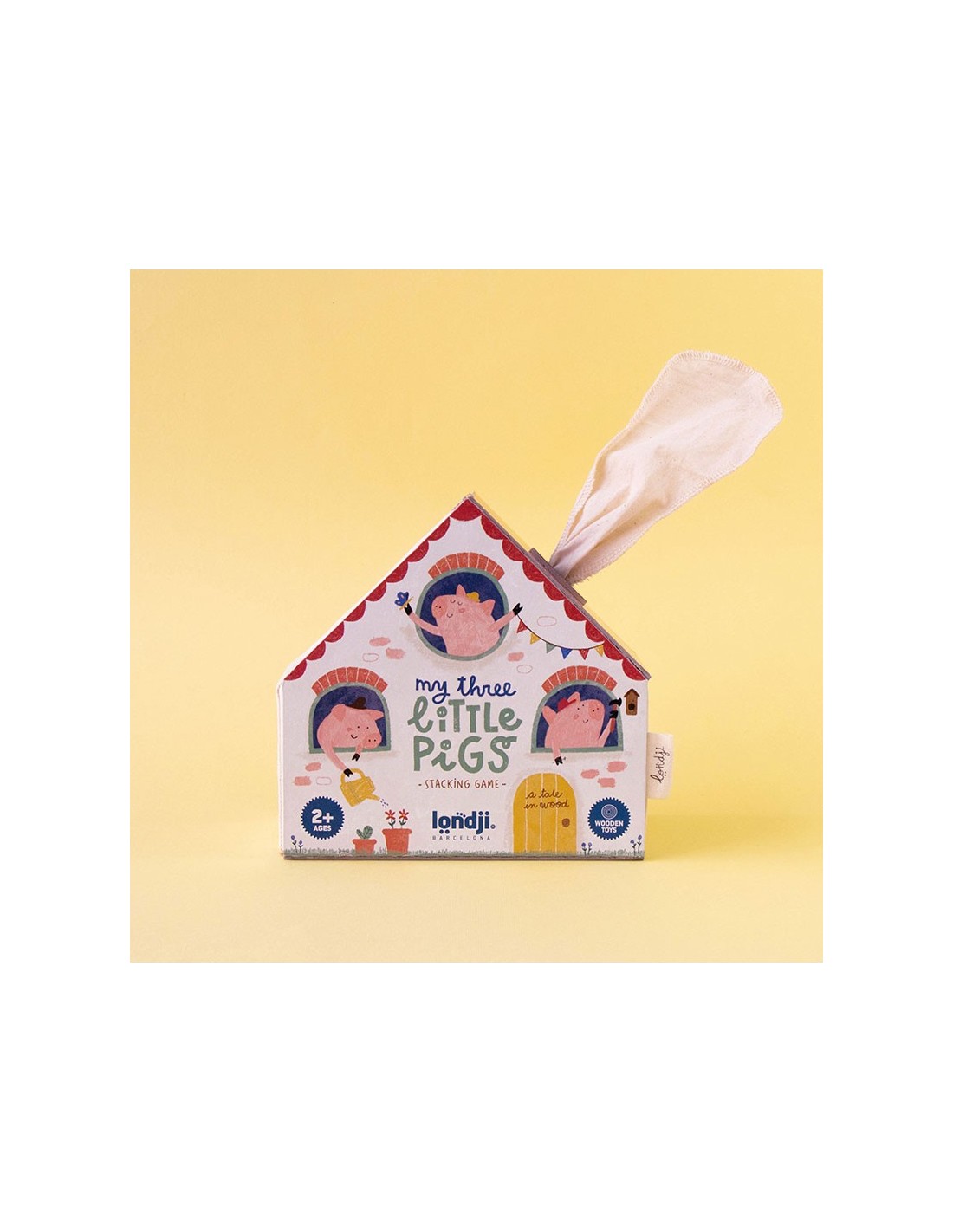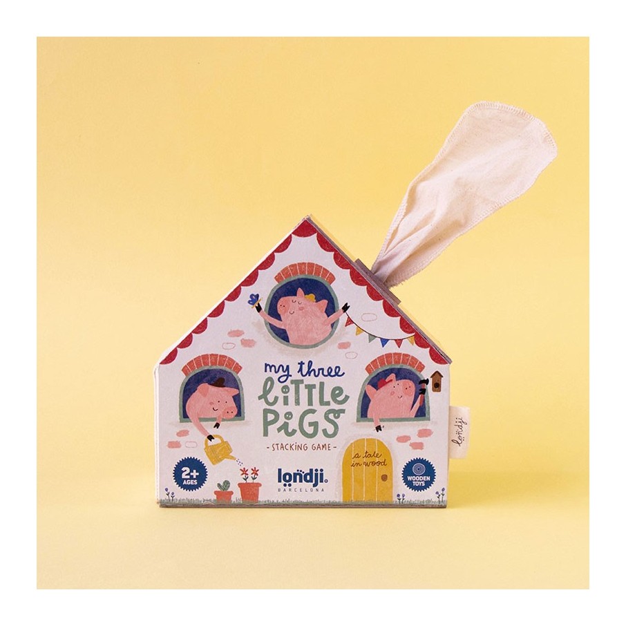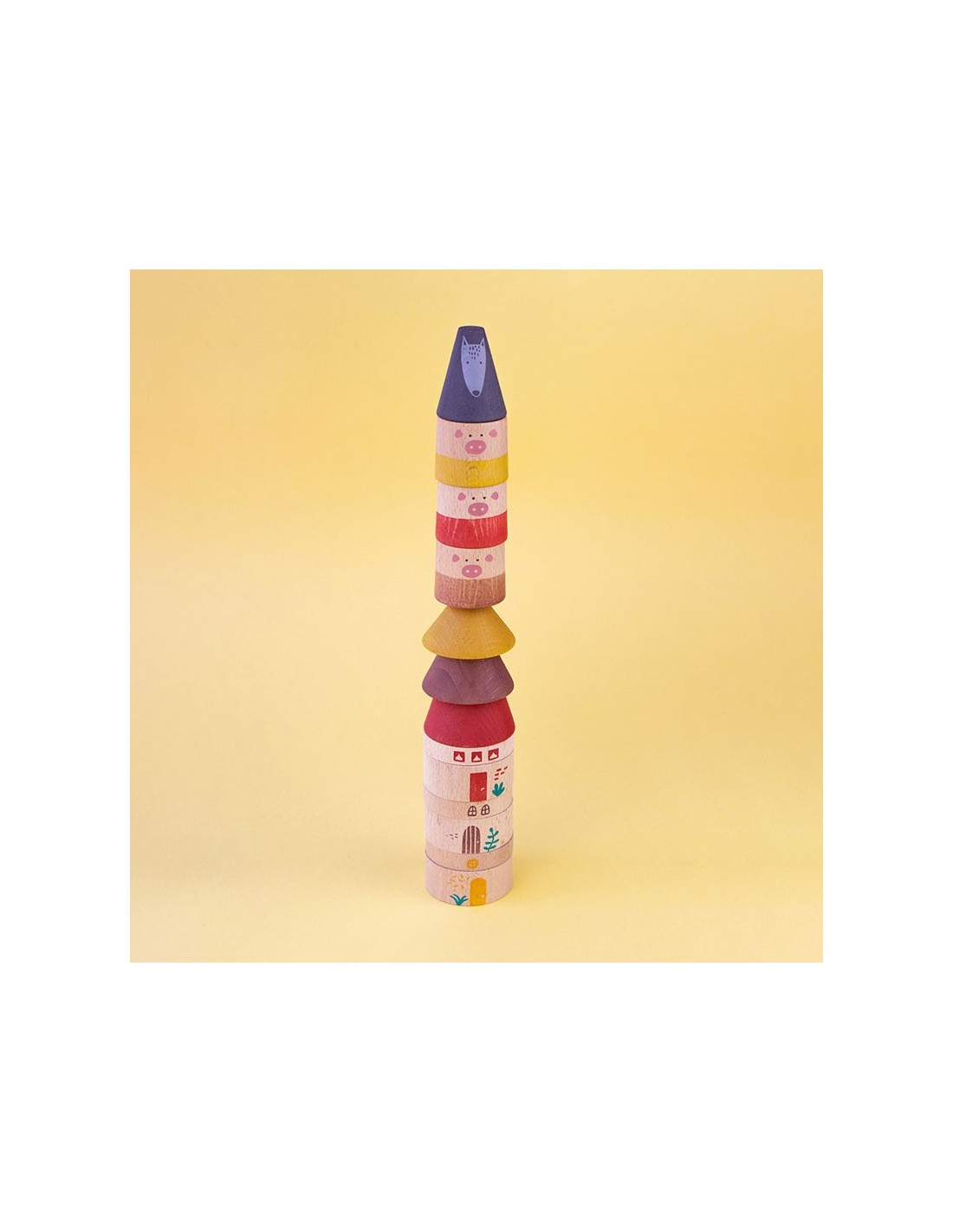 Un juguete de madera de los tres cerditos para apilar, encajar y contar historias. Juguete responsable y de proximidad. Diseñado y fabricado en Barcelona.![]()