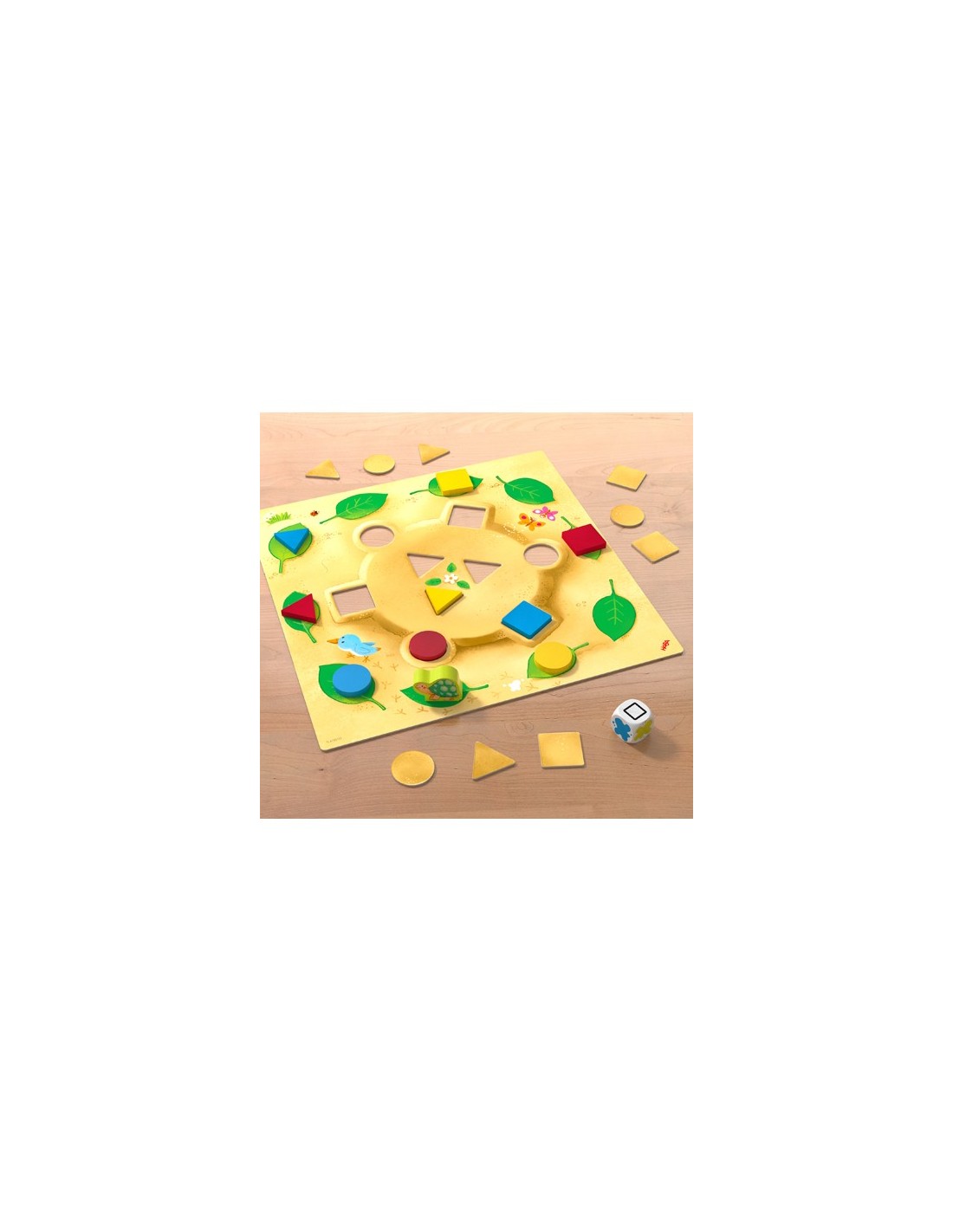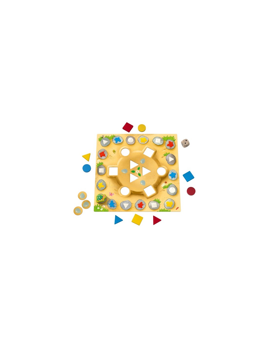 Contiene 1 tablero impreso a doble cara, 1 tortuga Tilda de madera, 2 dados (1 de puntos y 1 de colores y formas), 9 piezas geométricas de madera, 1 instrucciones del juego.