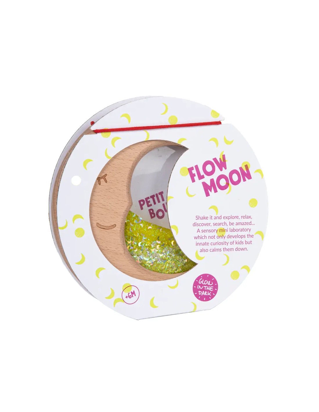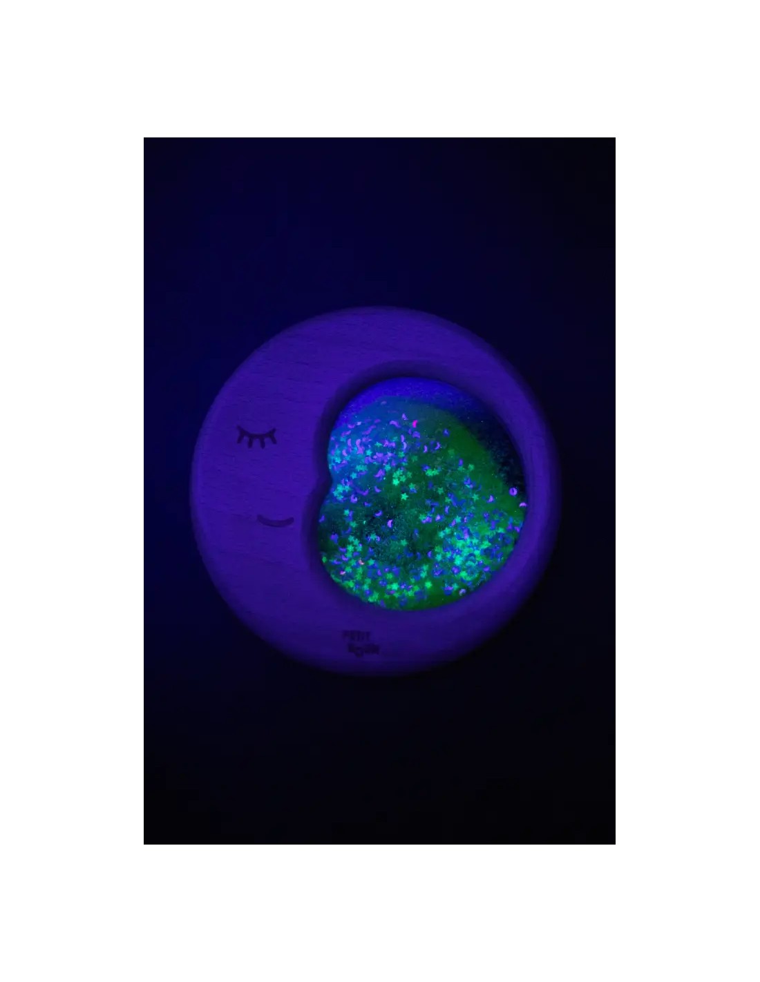 Dulces sueños. Nuestra Sensory Moon es una invitación a ensoñar y acurrucarse entre sus dulces centelleos luminosos. Fabricada en madera de haya natural, en su interior se agitan pigmentos que capturan la atención de los más pequeños, ayudándoles a ejercitar el seguimiento ocular y a entrar en un estado de calma. Nuestra Sensory Moon brilla en la oscuridad: basta con cargarla antes en una fuente de luz natural o de luz negra.