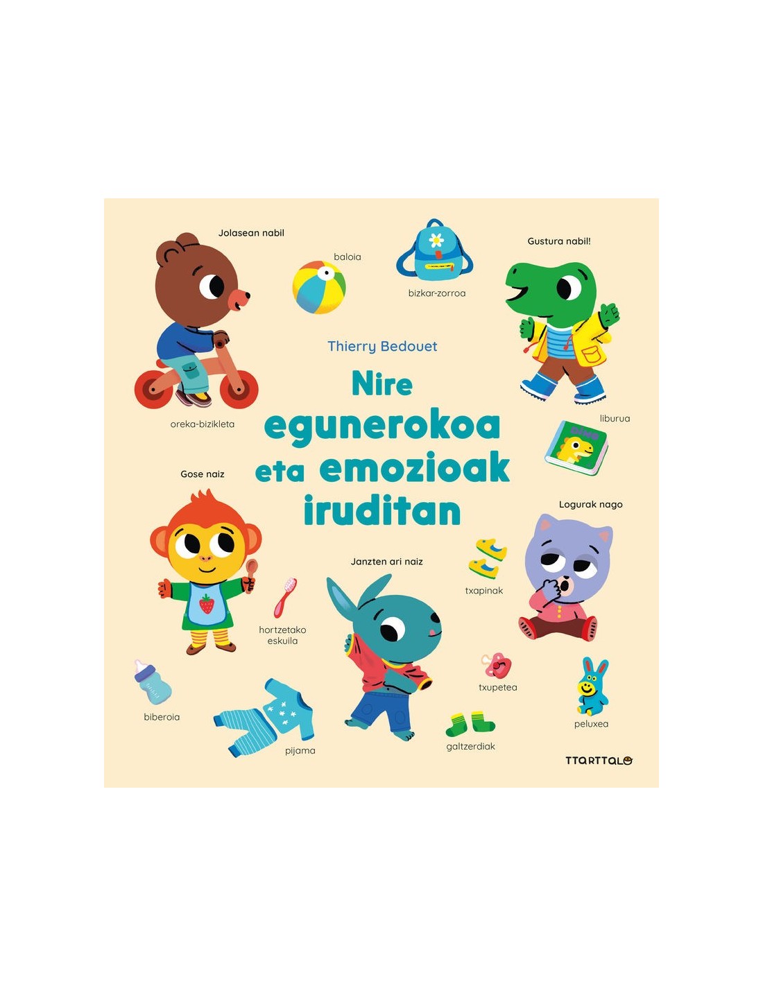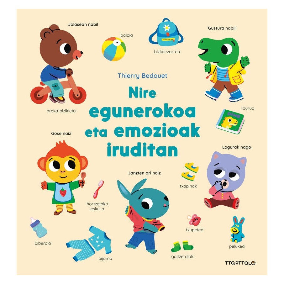 Liburu honetan haurtxoak eguneroko zereginetan murgilduko dira: esnatu, gosaldu, parkean jolastu, bazkaldu, bainua hartu...