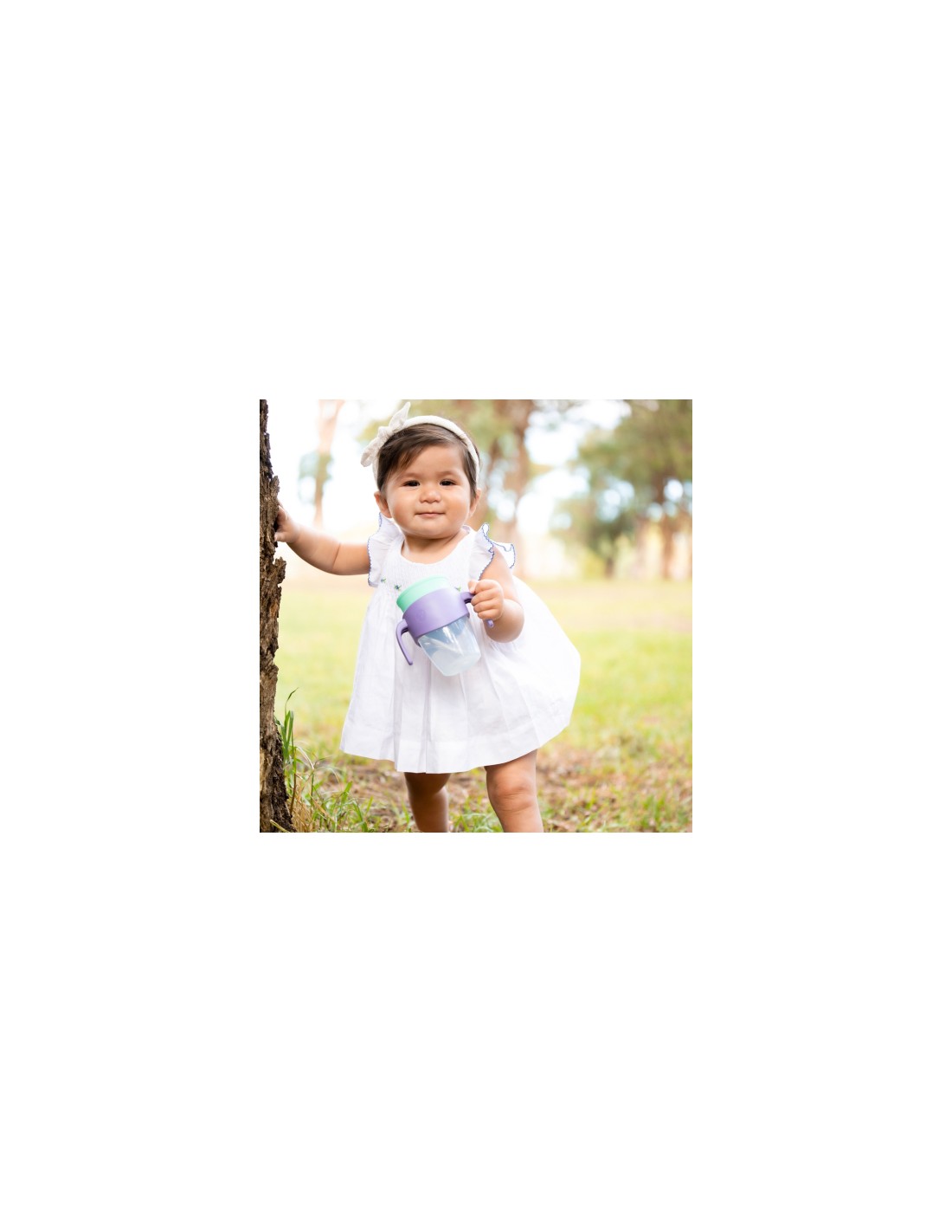 Con el control del flujo (cuanto más fuerte succionen, más líquido saldrá) minimiza los derrames. Las asas de perfil ancho son fáciles de agarrar para las manitas pequeñas, lo que favorece la independencia al beber.