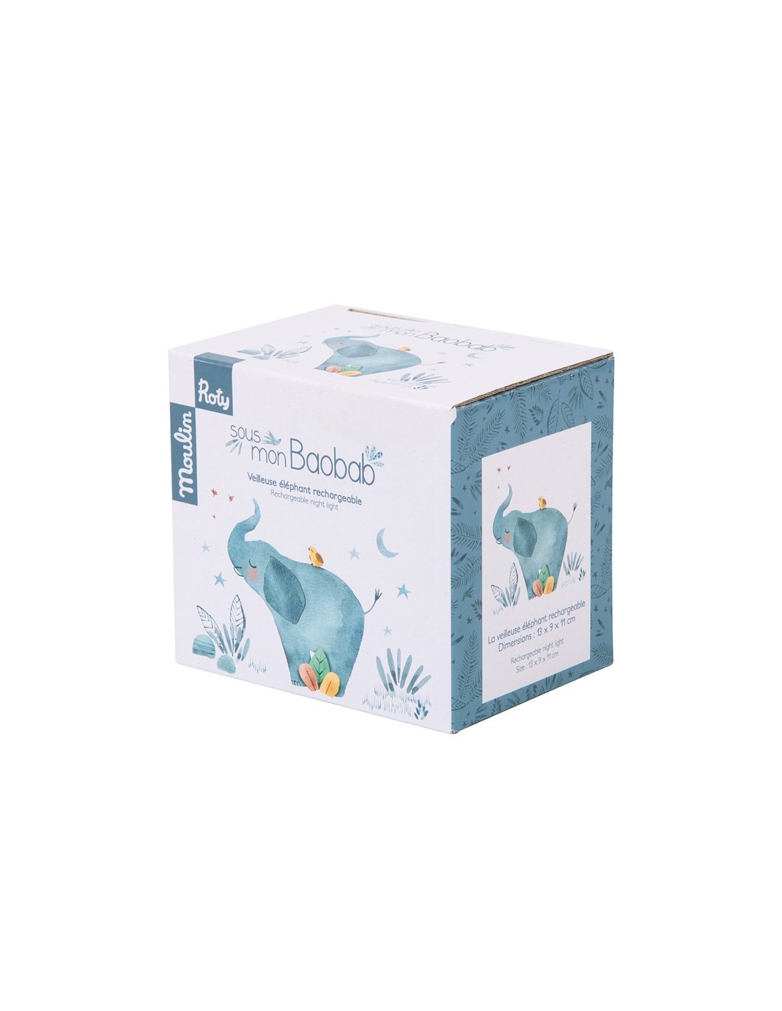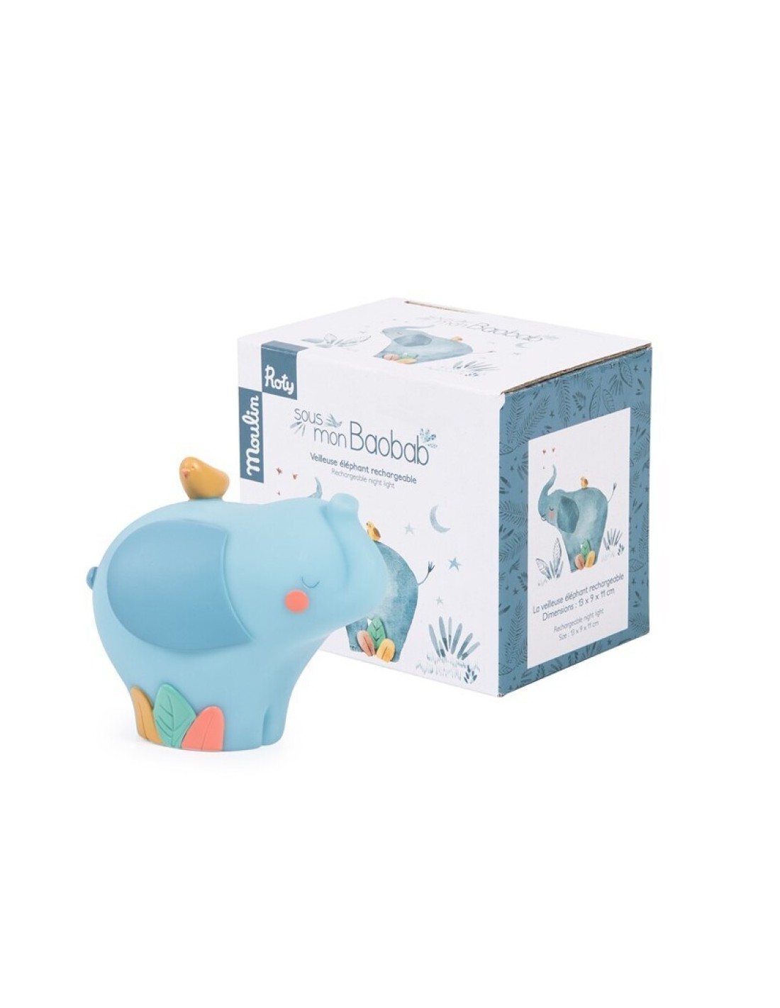 Lamparita de silicona suave con diseño de elefante, se carga a través de USB, tiene una autonomía de 15h y un modo temporizador que permite que se apague a los 30 minutos. Emite una luz tenue que ayudará a dormir de forma tranquila y segura.