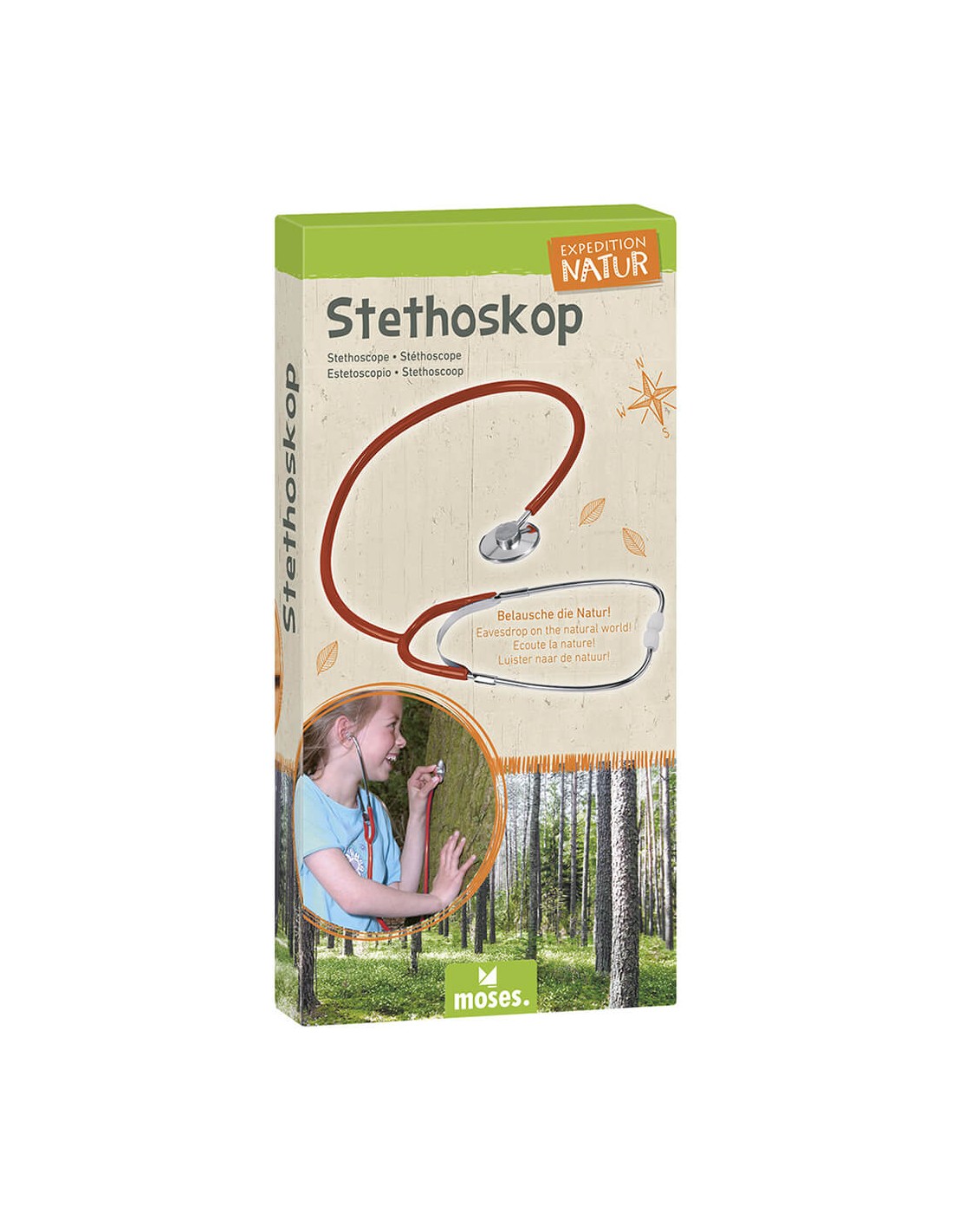 Estetoscopio, escucha los sonidos del cuerpo humano y la naturaleza. Tamaño adaptado a la morfología infantil.
