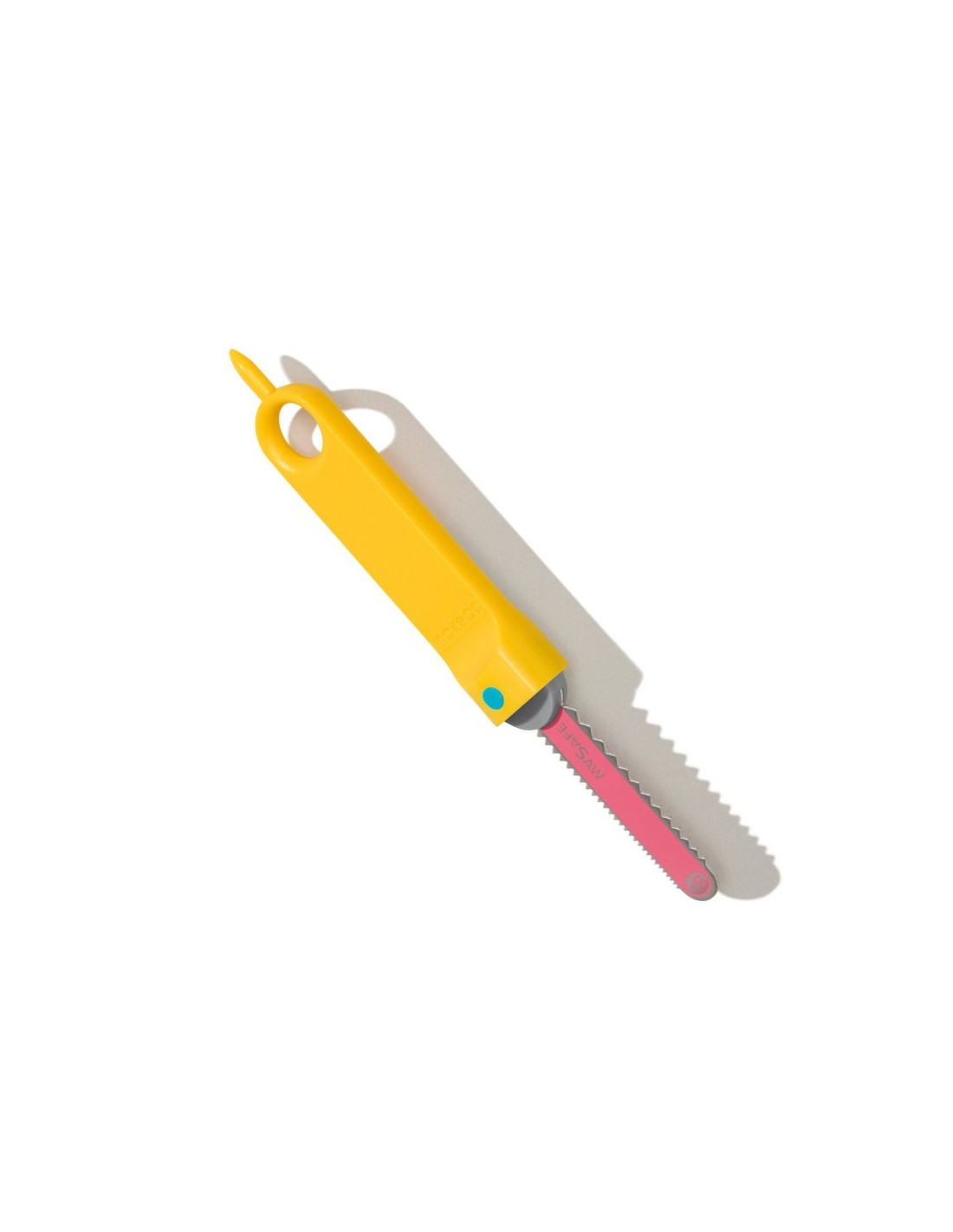La sierra Safe Saw Junior incorpora un punzón de plástico en el extremo del mango para hacer agujeros en el cartón y unir las piezas con los tornillos Scru, o para hacer incisiones que hagan de guía en el cortado.