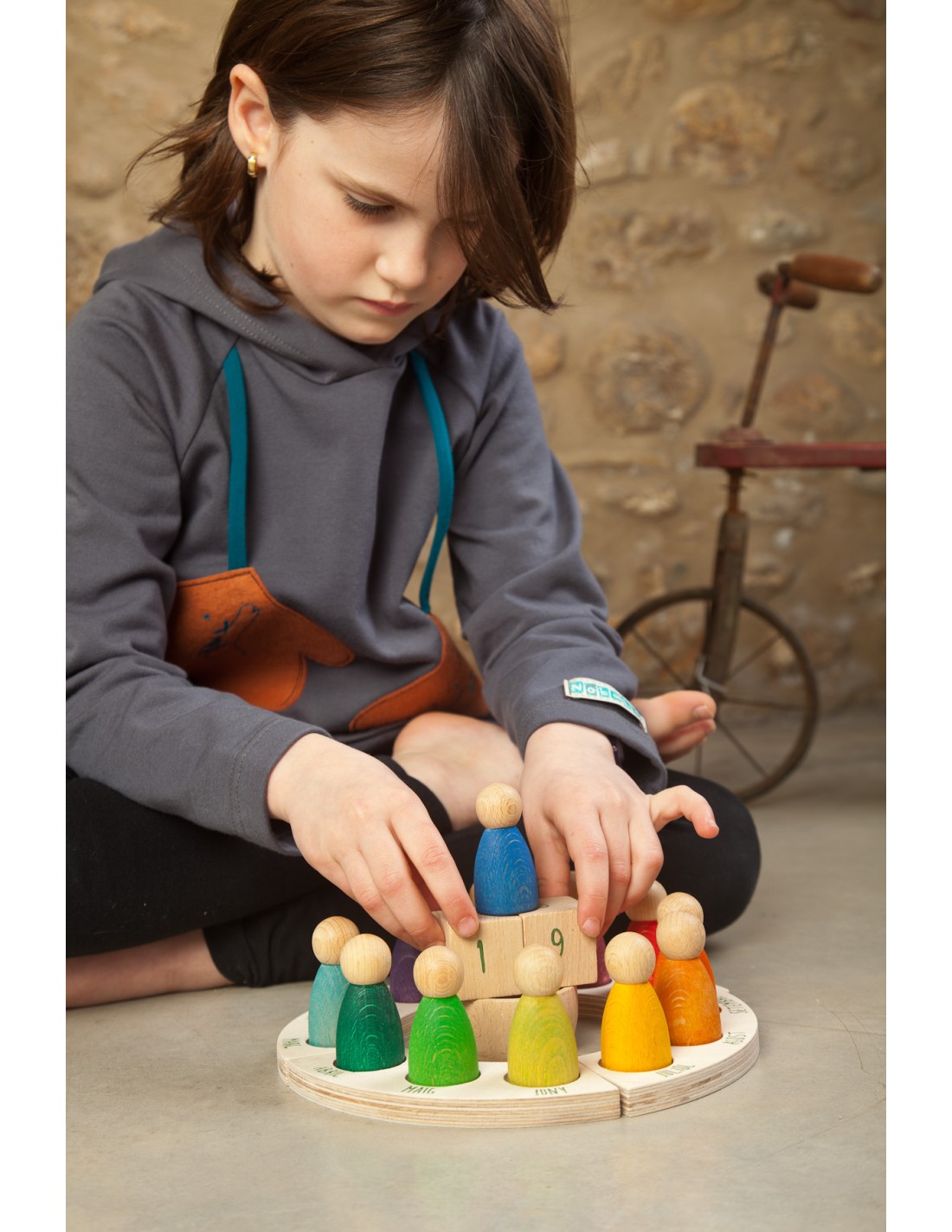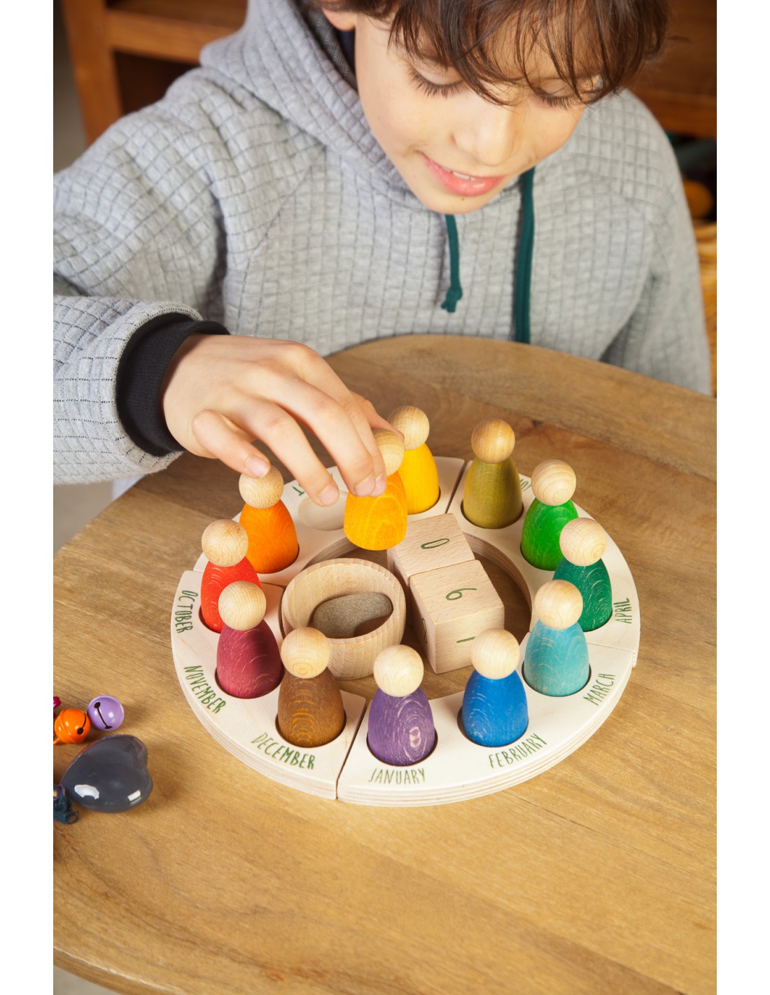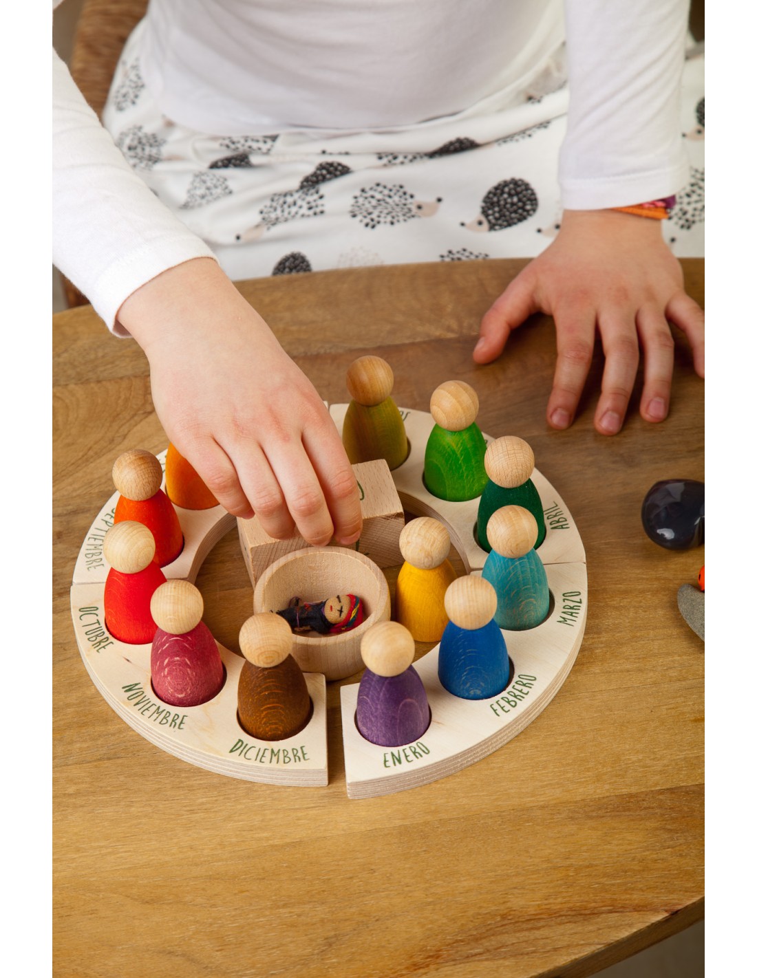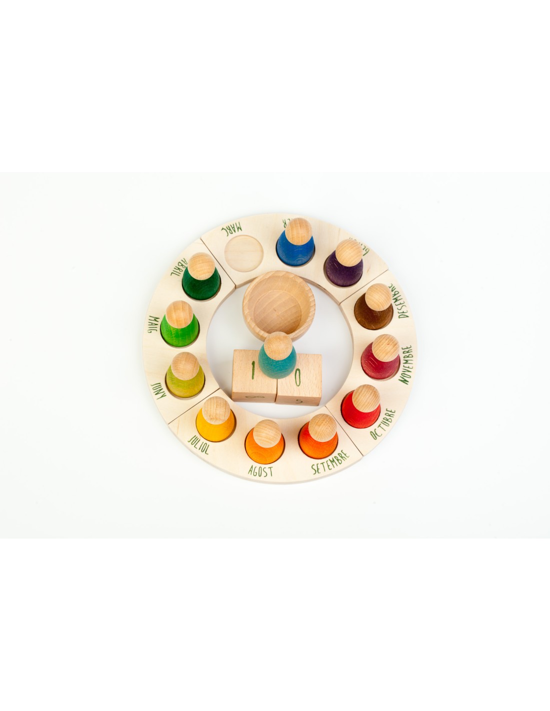 Contiene 12 Nins® en 12 colores de acuerdo con la pedagogía Waldorf, tanto para determinar el mes y su estación del año. 1 cuenco de madera de haya natural, dos dados de madera de haya natural con los números de los días impresos y una plataforma distribuida en 4 secciones que determinan las estaciones, estampadas con los meses del año.