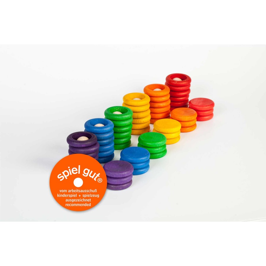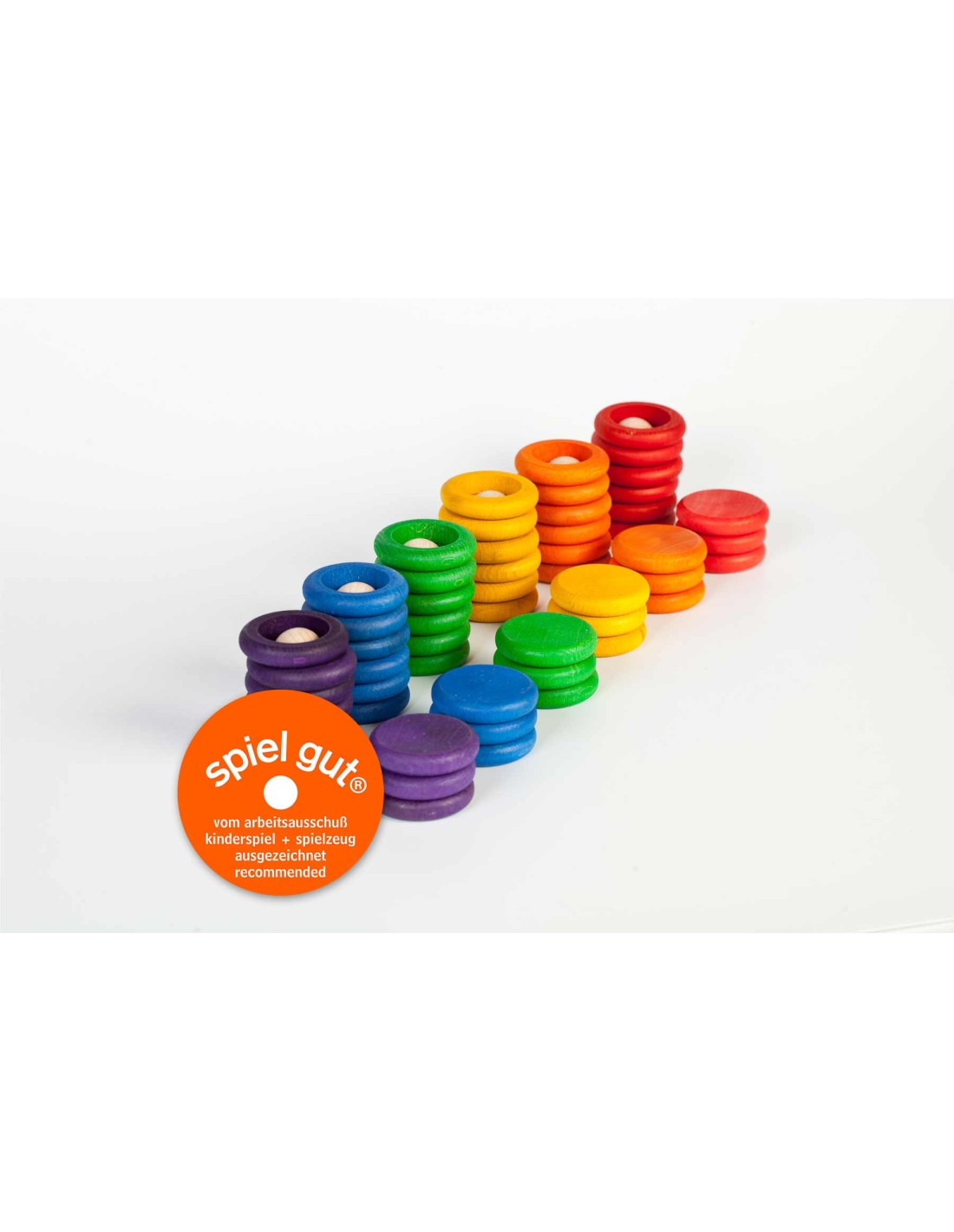 Contiene 6 Nins, 36 anillas y 18 monedas en los colores del arco iris.