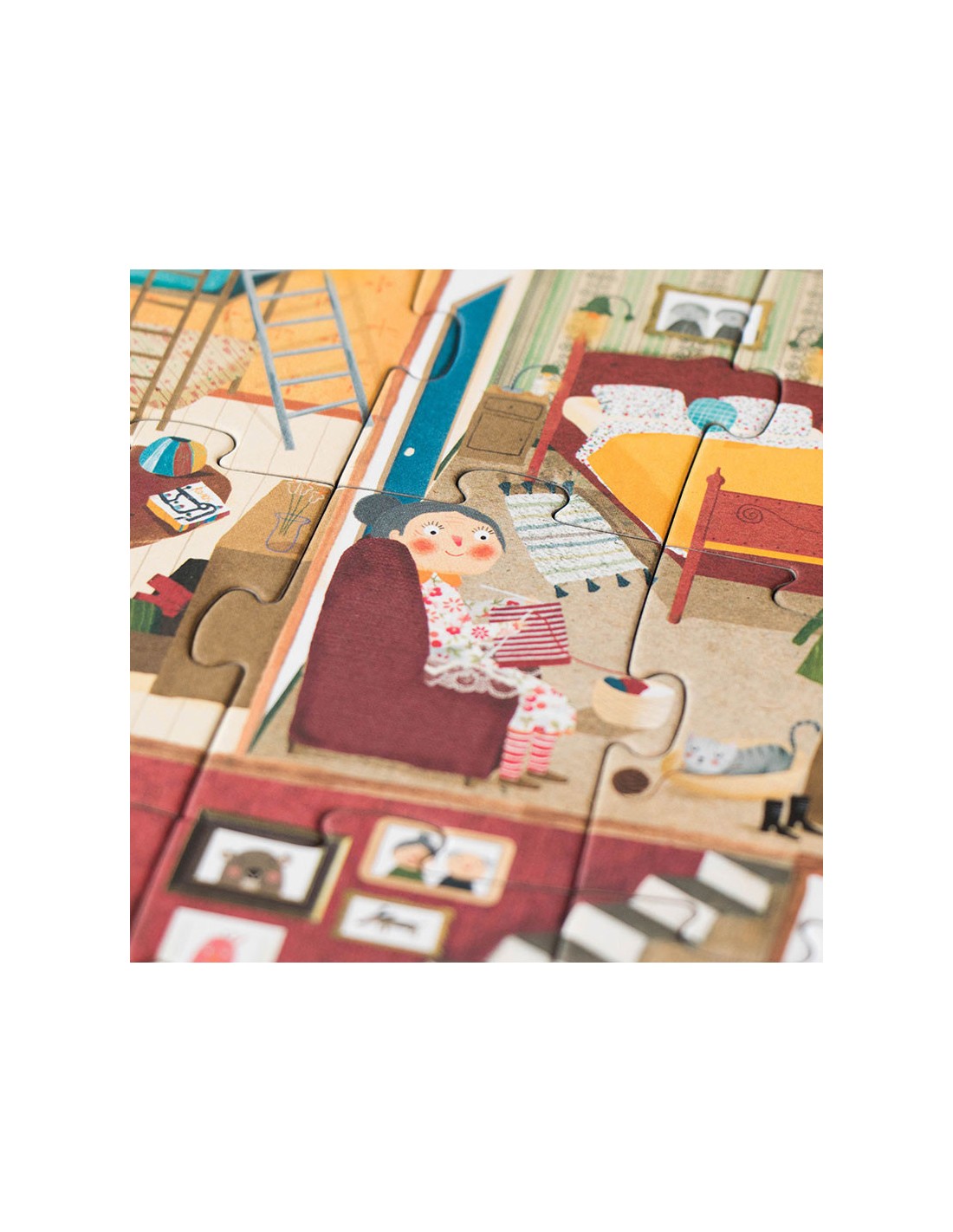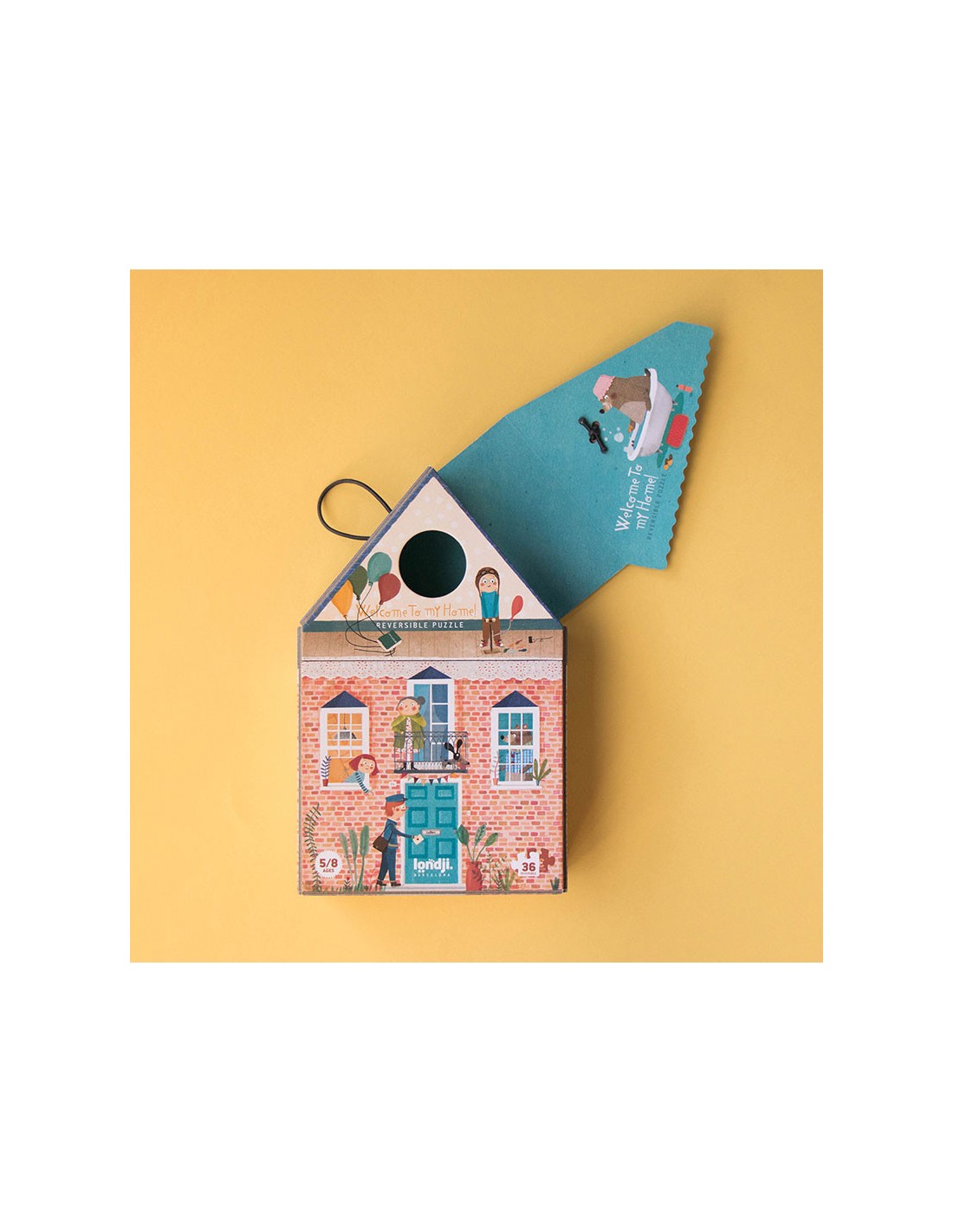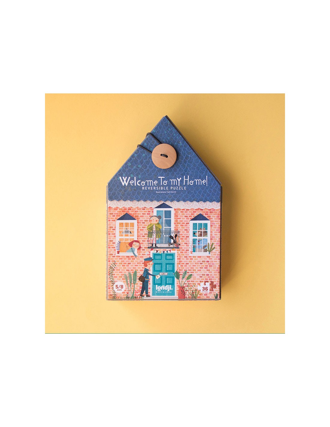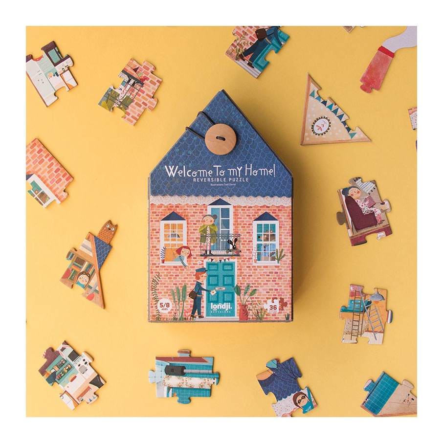 Un puzzle reversible de 36 piezas que muestra dos escenas: el interior y el exterior de una casa y sus habitantes. Un juguete de calidad hecho en Barcelona.