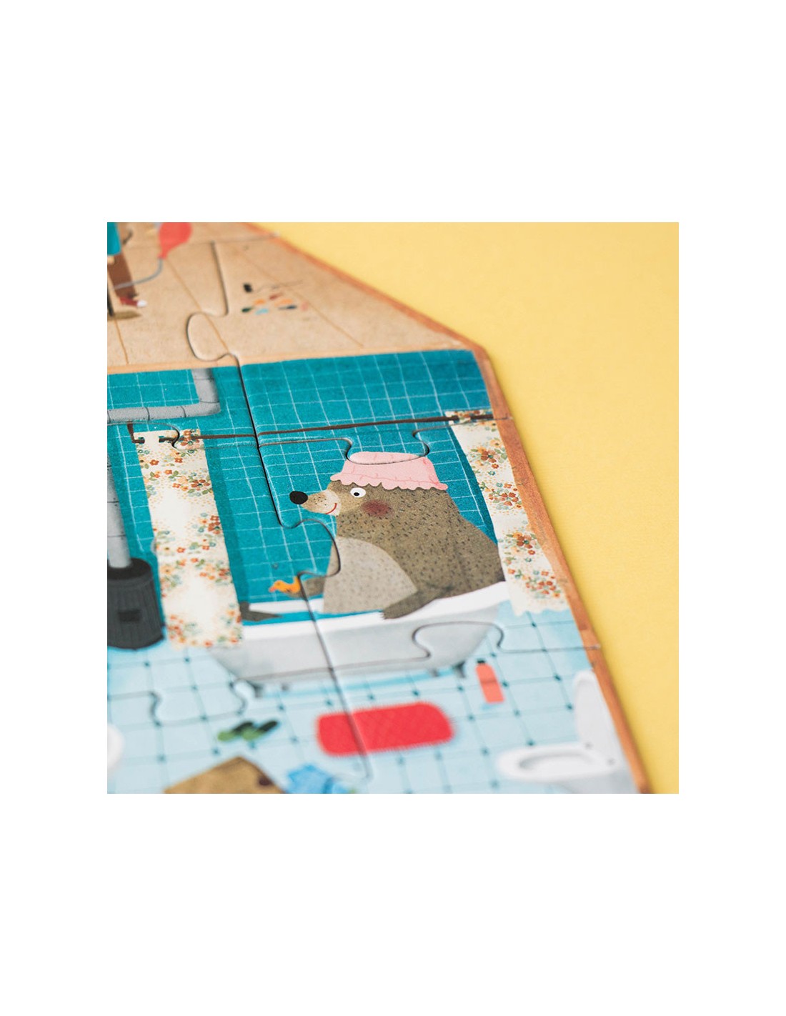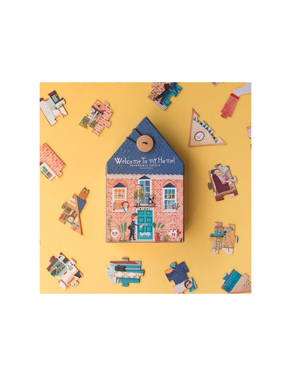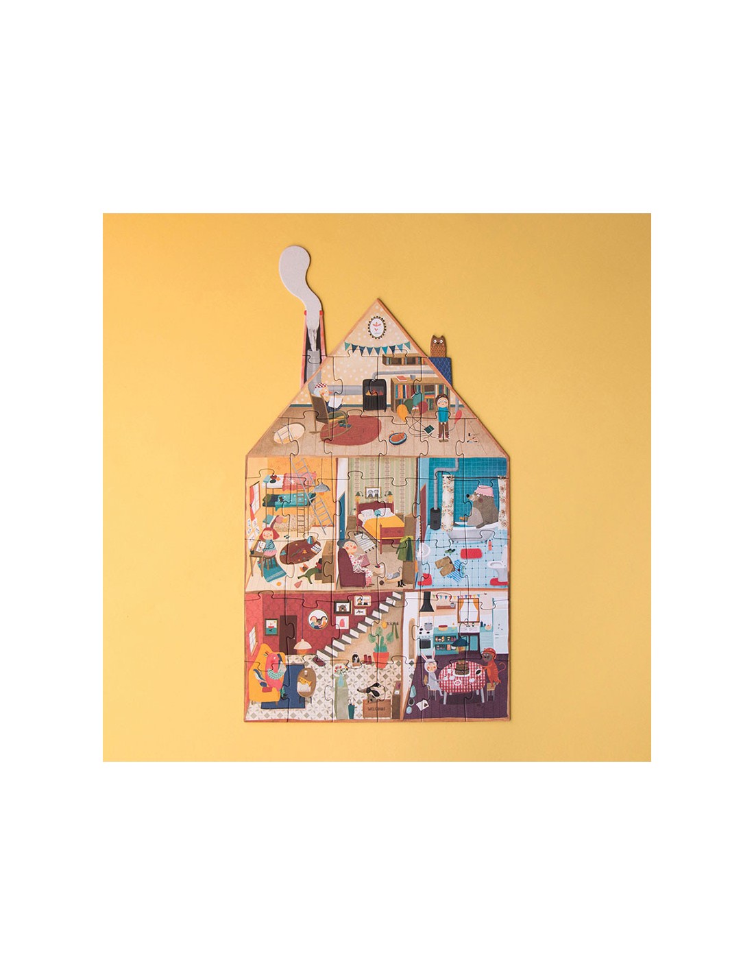 Un puzzle reversible de 36 piezas que muestra dos escenas: el interior y el exterior de una casa y sus habitantes. Un juguete de calidad hecho en Barcelona.