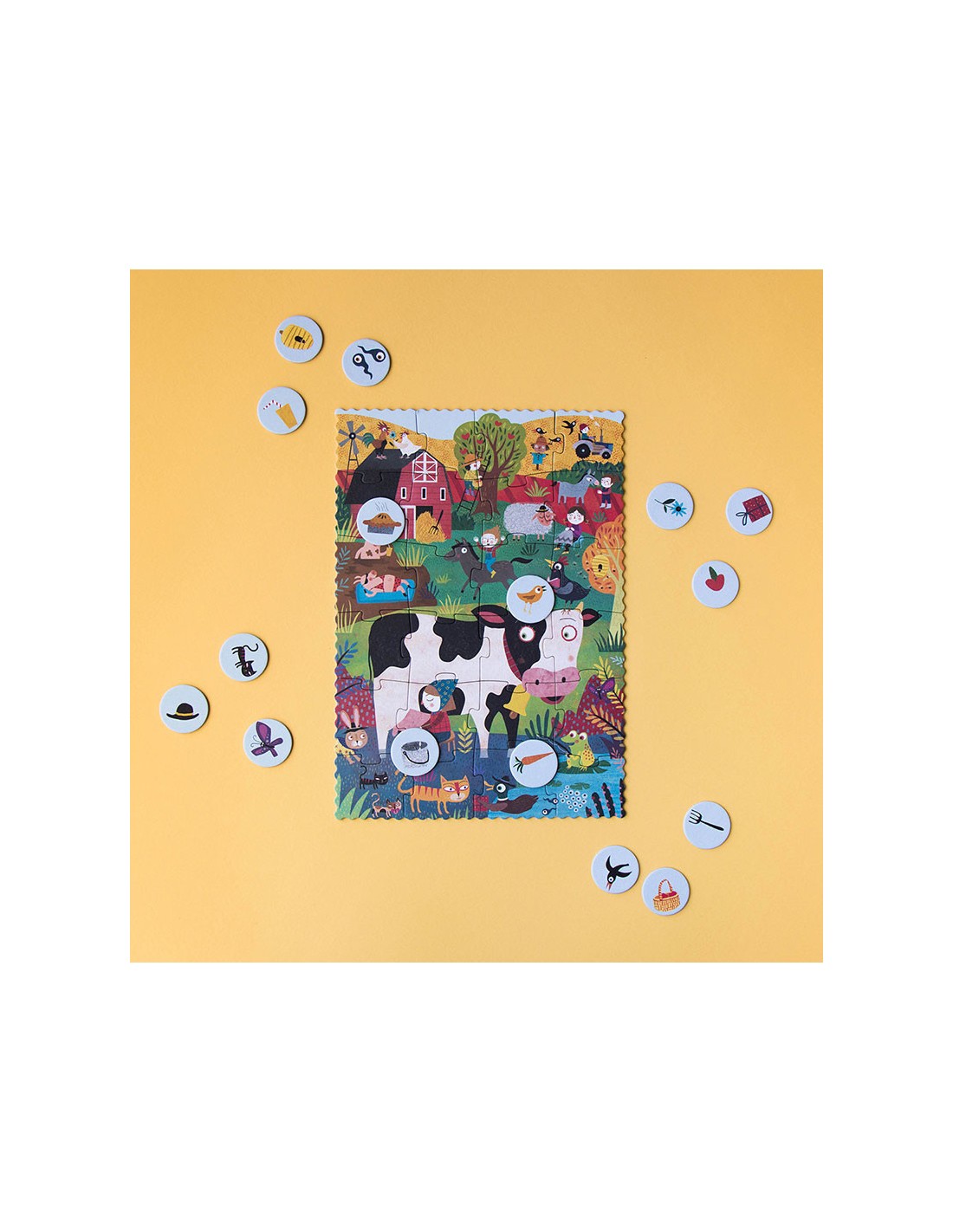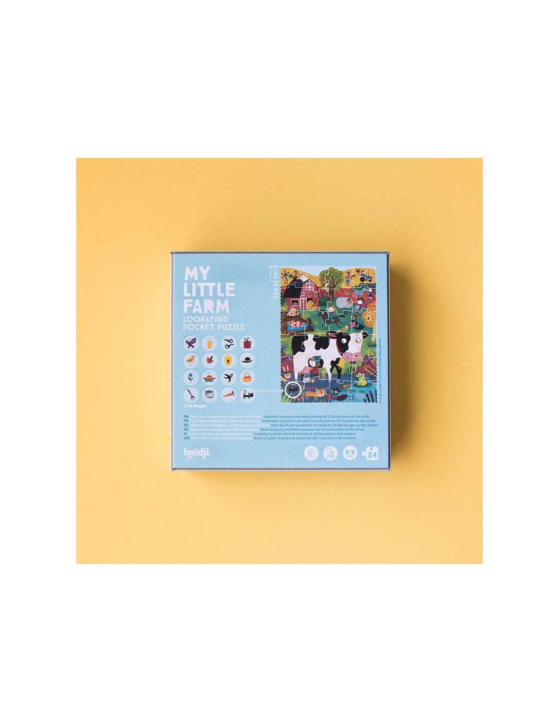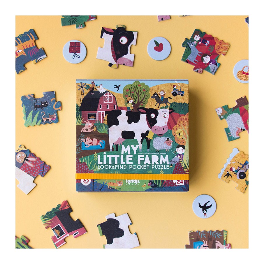 ¡Un puzzle pequeño de 24 piezas de una granja, sus animales y un juego de observación en versión de bolsillo para que lo puedas llevar a todas partes!