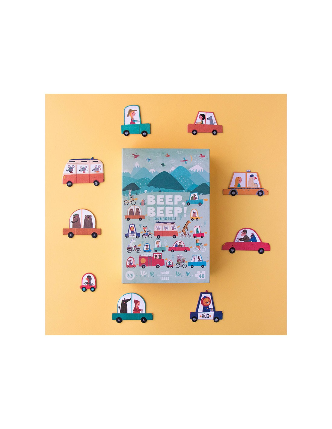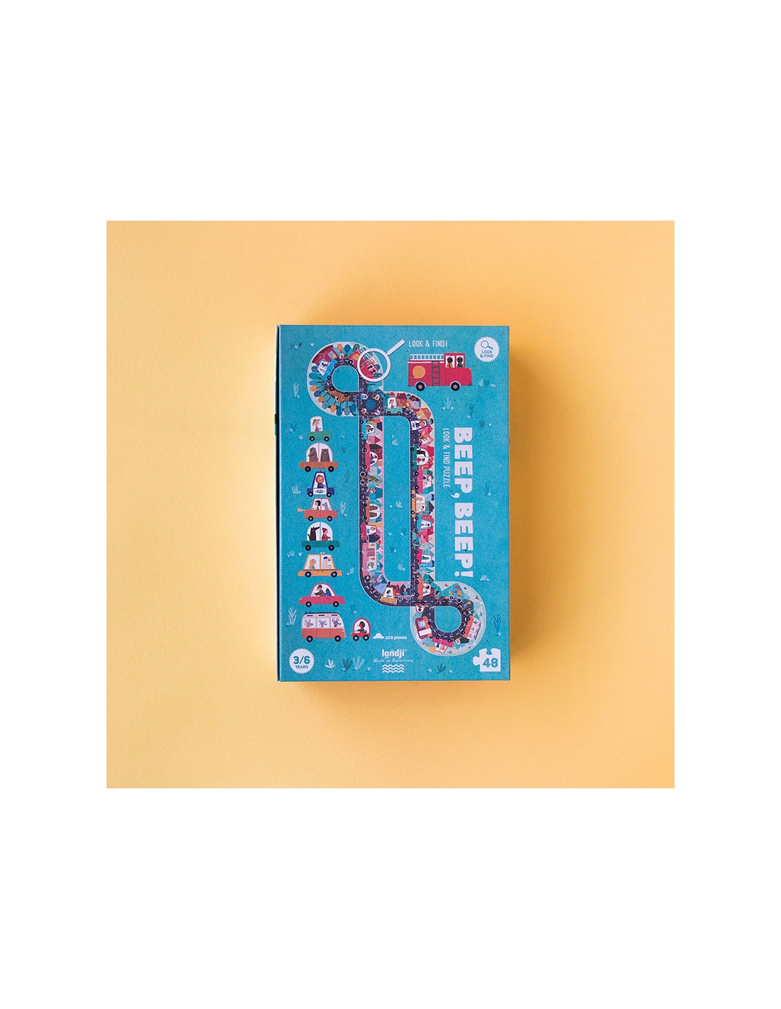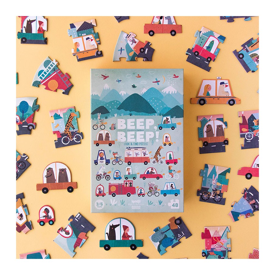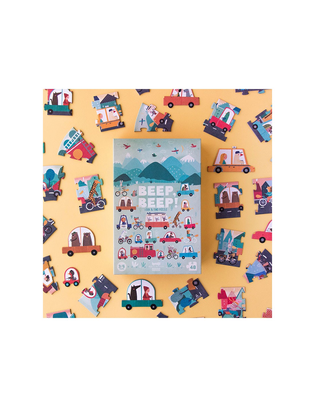 Un puzzle de 48 piezas y un juego de observación con 10 piezas para los más pequeños. Resuelve el puzzle y después busca los personajes de los coches.
