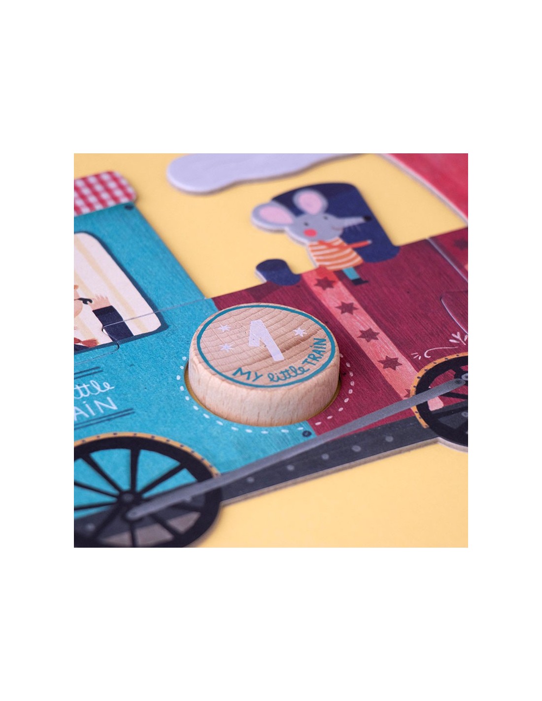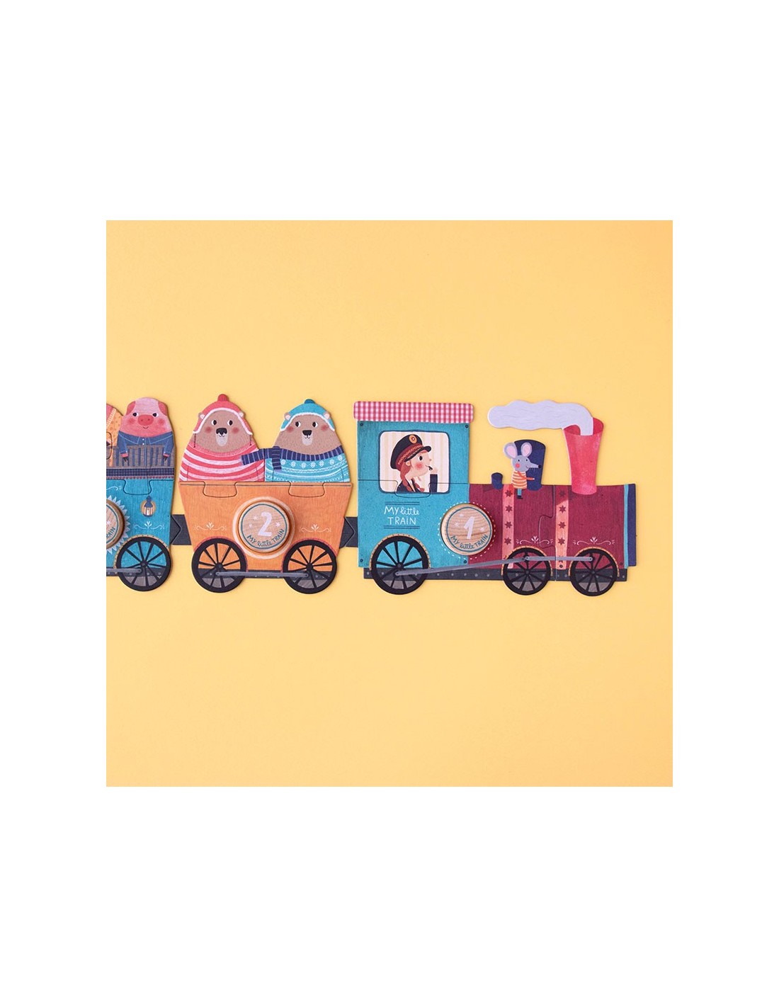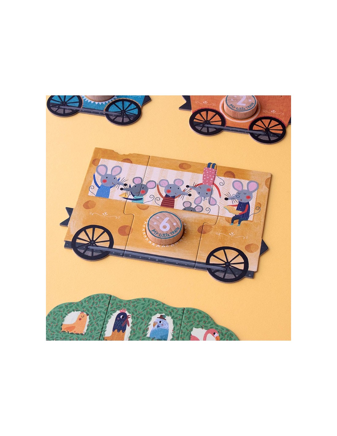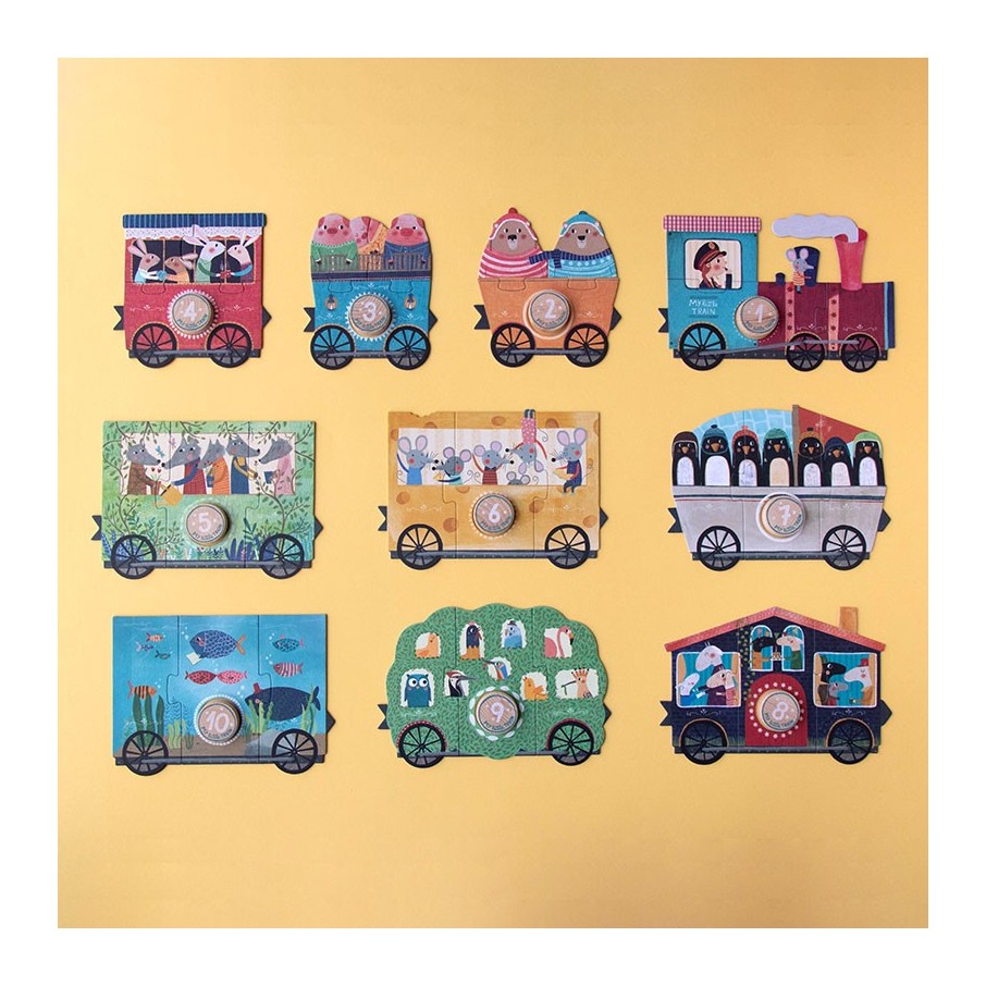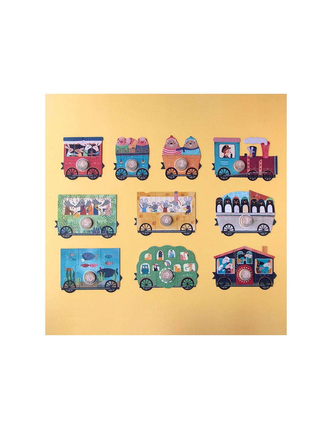 10 puzles en forma de vagones de tren de 3 piezas con una pieza de madera encajable para cada uno.