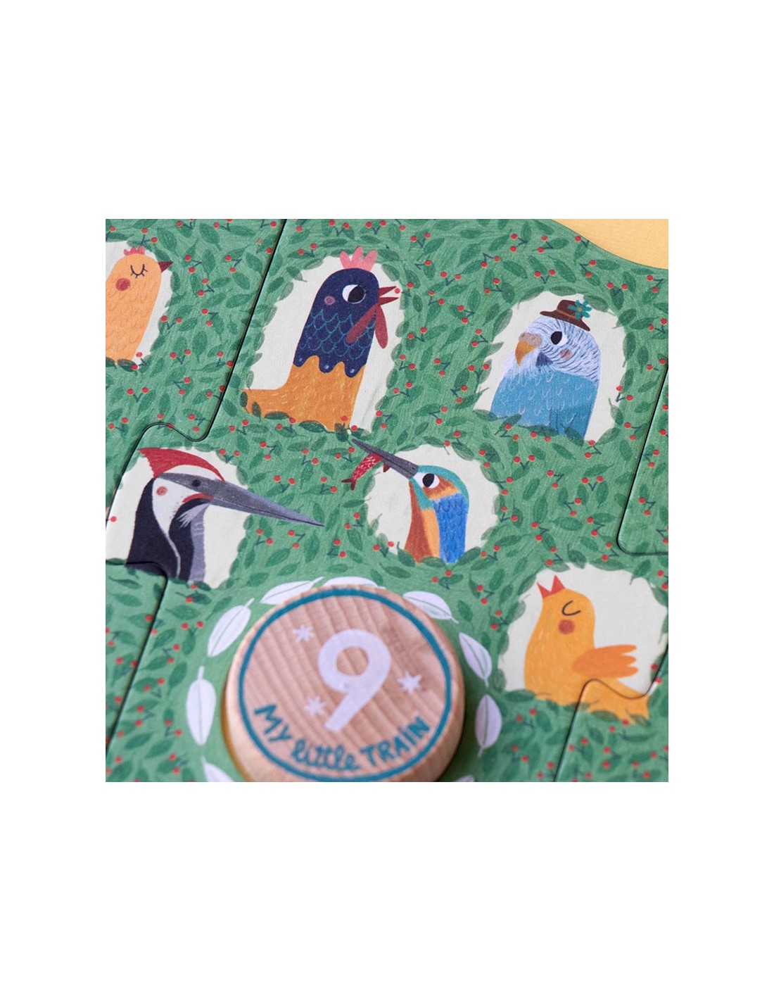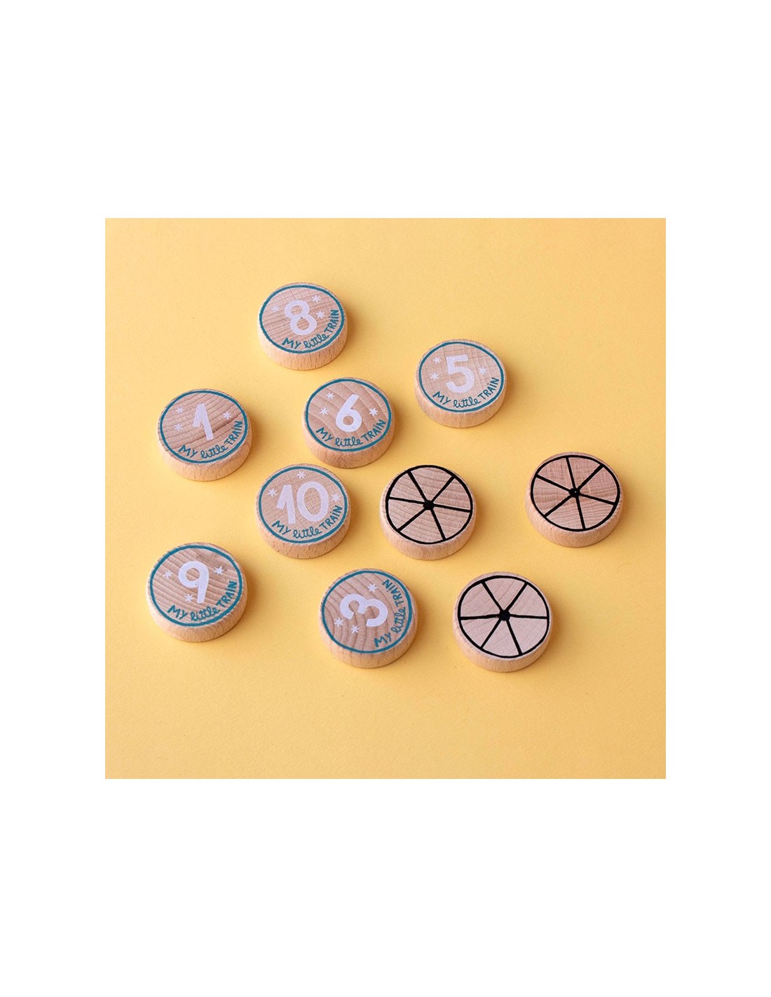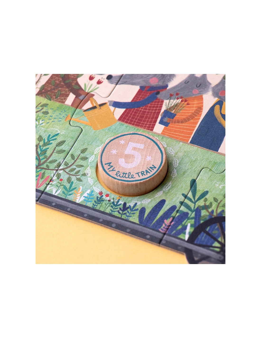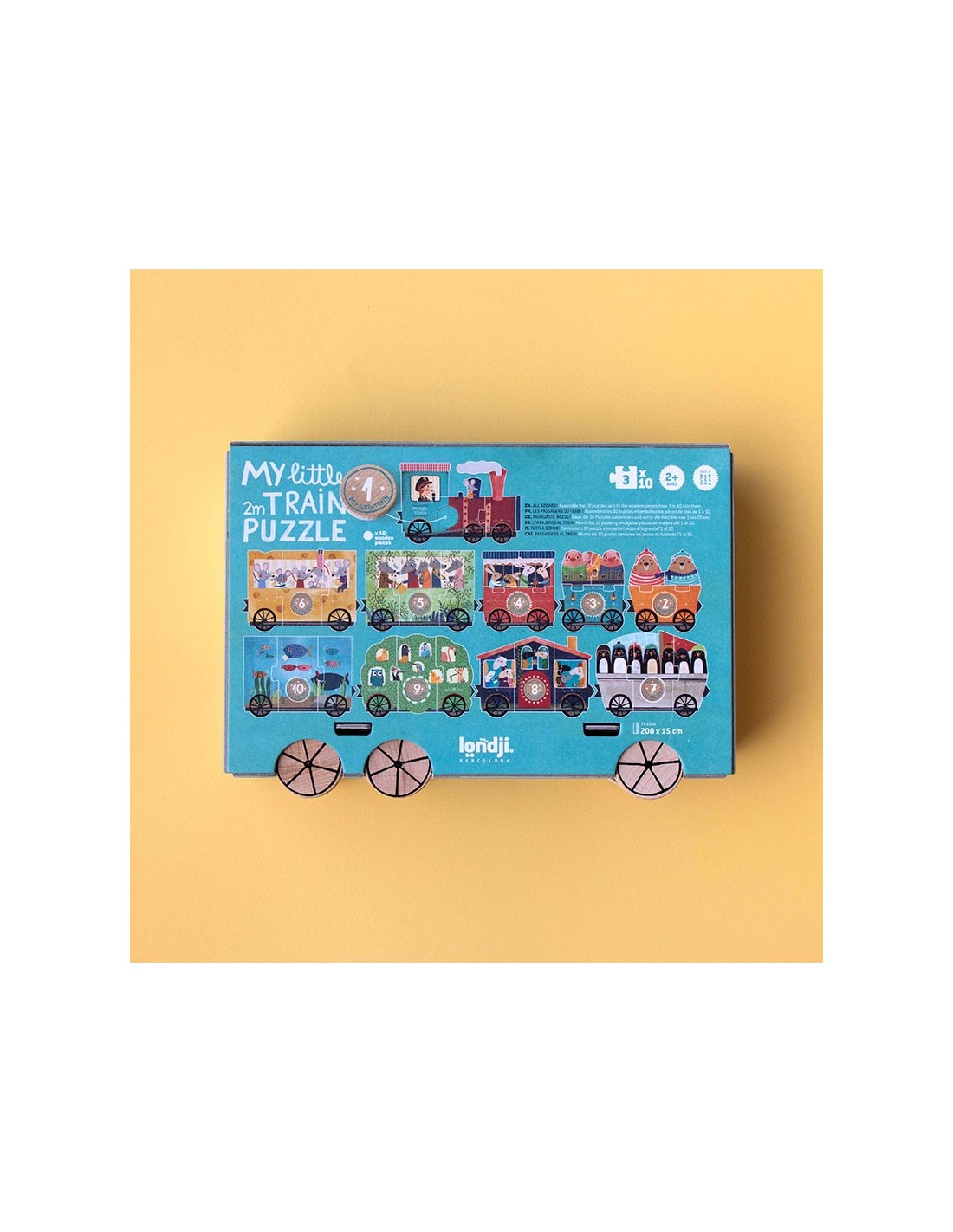 10 puzles en forma de vagones de tren de 3 piezas con una pieza de madera encajable para cada uno.