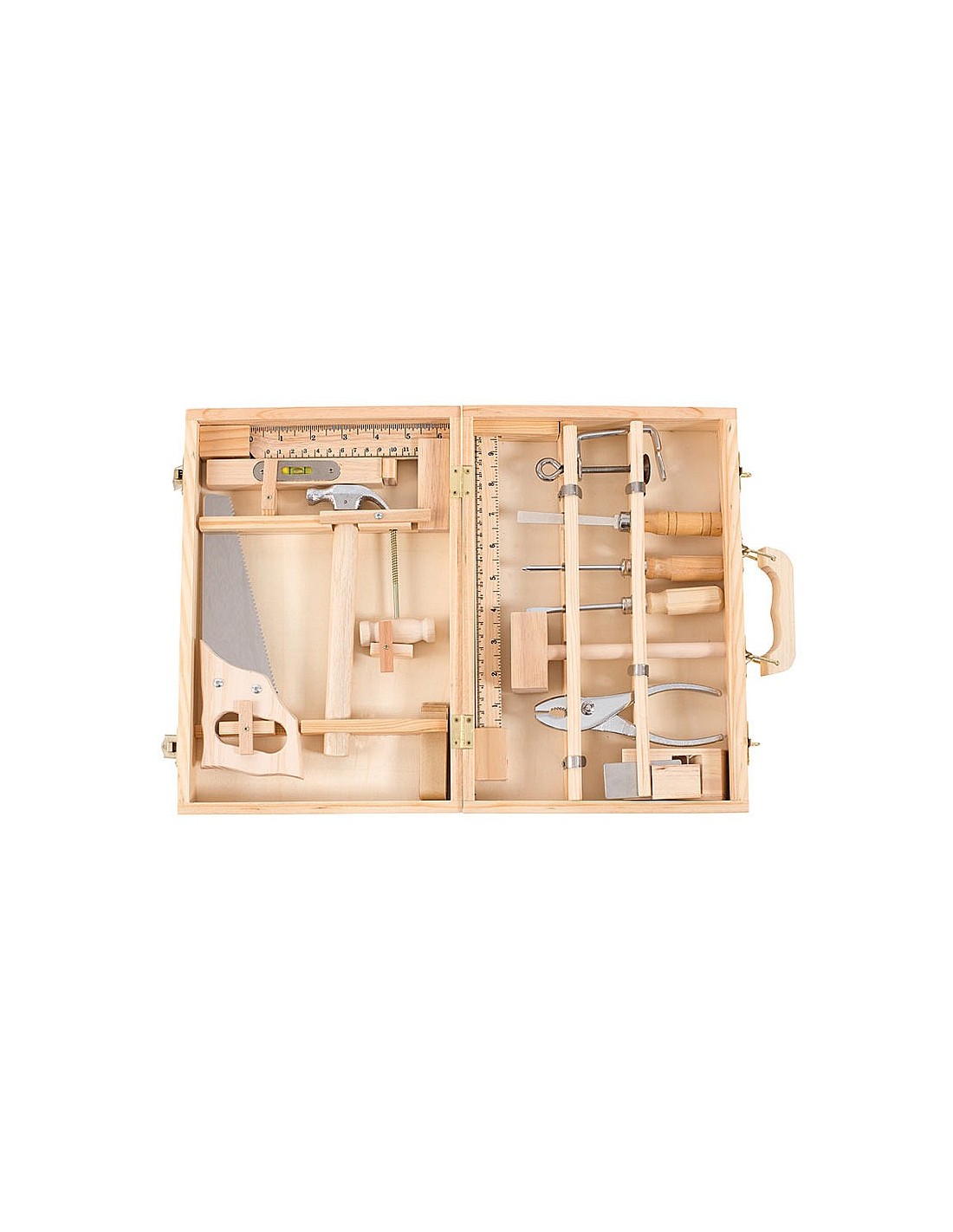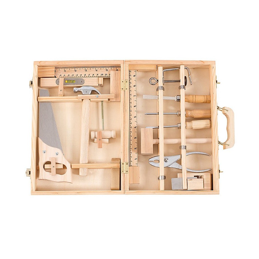 Este precioso maletín de madera contiene 14 herramientas reales: una sierra, un martillo, un cincel, una regla para medir y una escuadra, un lápiz de carpintero, un nivel, una lima, una maza, unos alicates, dos destornilladores reales, un taladro, papel para limar y un argento, un pack completo con el que disfrutar de la carpintería.