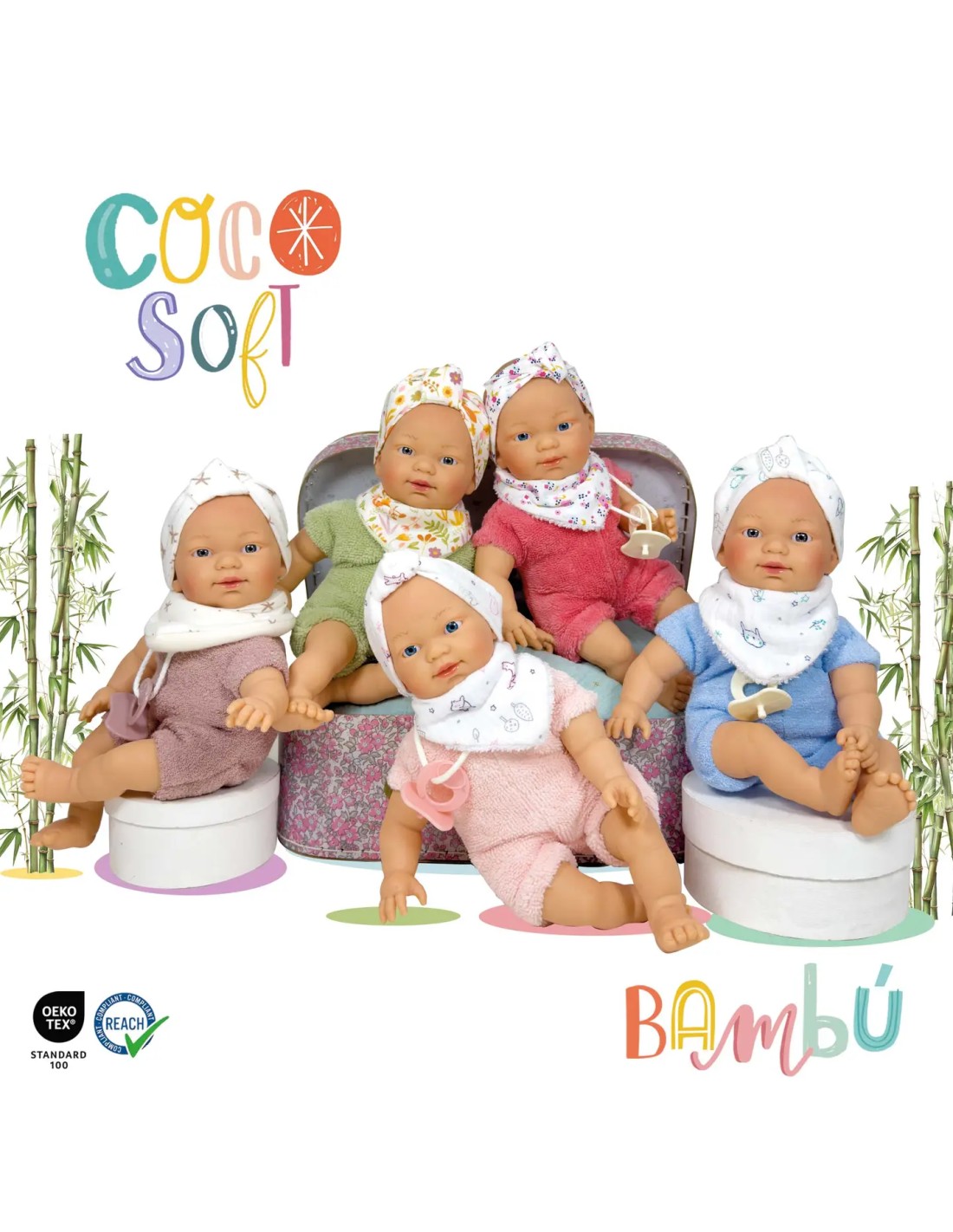 Están especialmente creados para la primera infancia. A excepción de la cabeza de vinilo, las piernas y los brazos, su cuerpo es completamente blandito y su tejido es de suave algodón y bambú. La microesponja de bambú se caracteriza por una textura ultra suave y su capacidad de absorción. Con etiqueta OEKO-TEX STANDARD 100 CLASSE 1, garantiza que todos los compostantes utilizados en el proceso de fabricación no generan riesgo para la salud del consumidor.