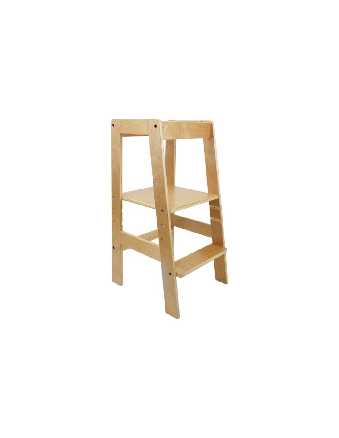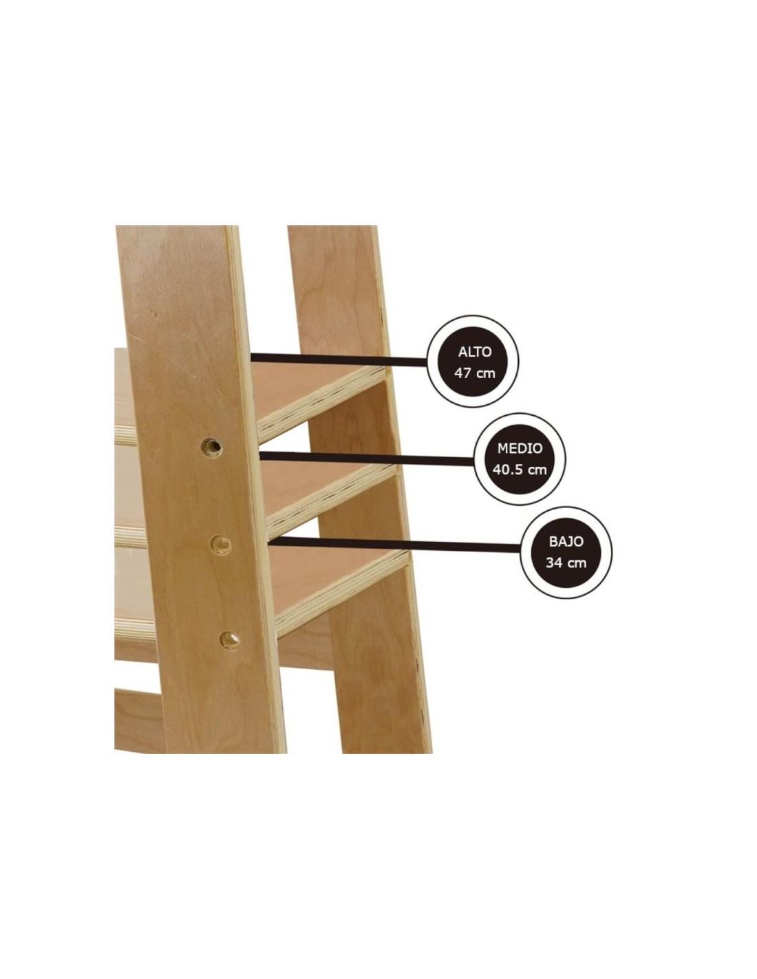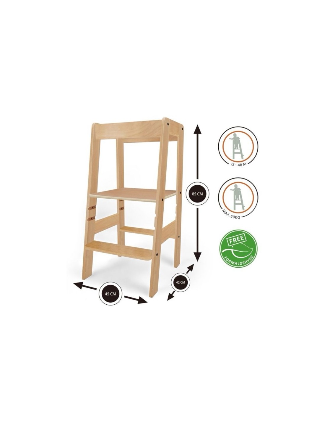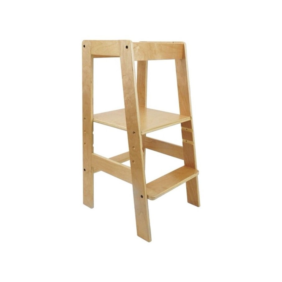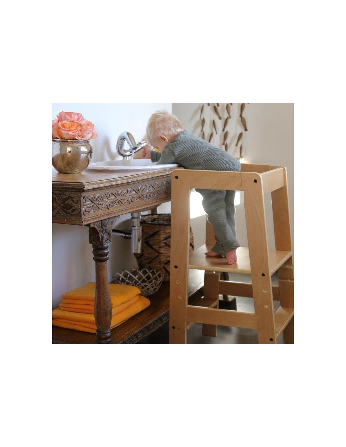 La Torre de aprendizaje EXPLORER tiene la altura justa para la mayoría de encimeras de las cocinas y de los muebles de lavabo de los cuartos de baño. Tiene un peldaño de seguridad a 20 cm por encima del suelo. La estructura tiene tres posiciones de altura y está pensada para crecer a medida que lo hace el niño.