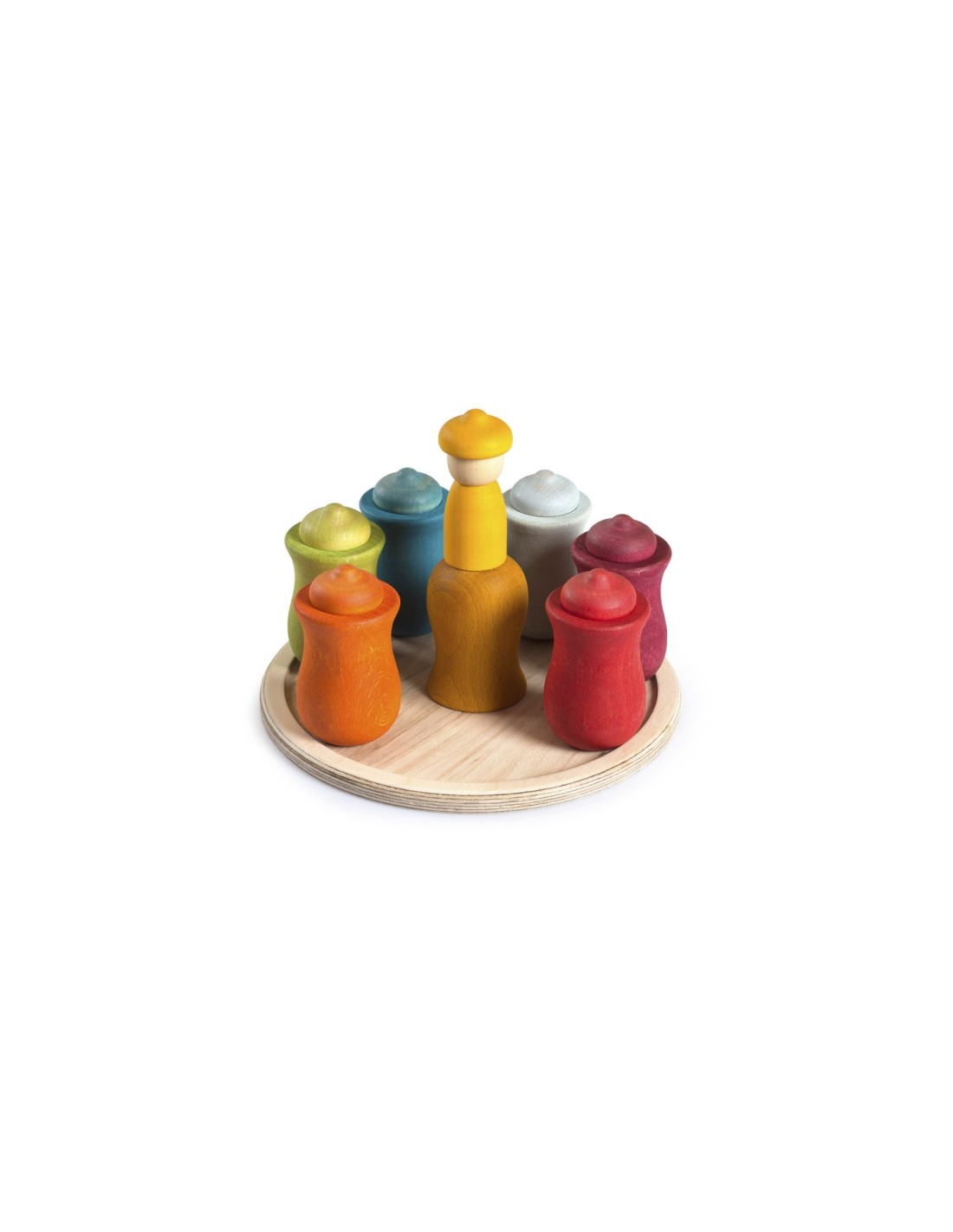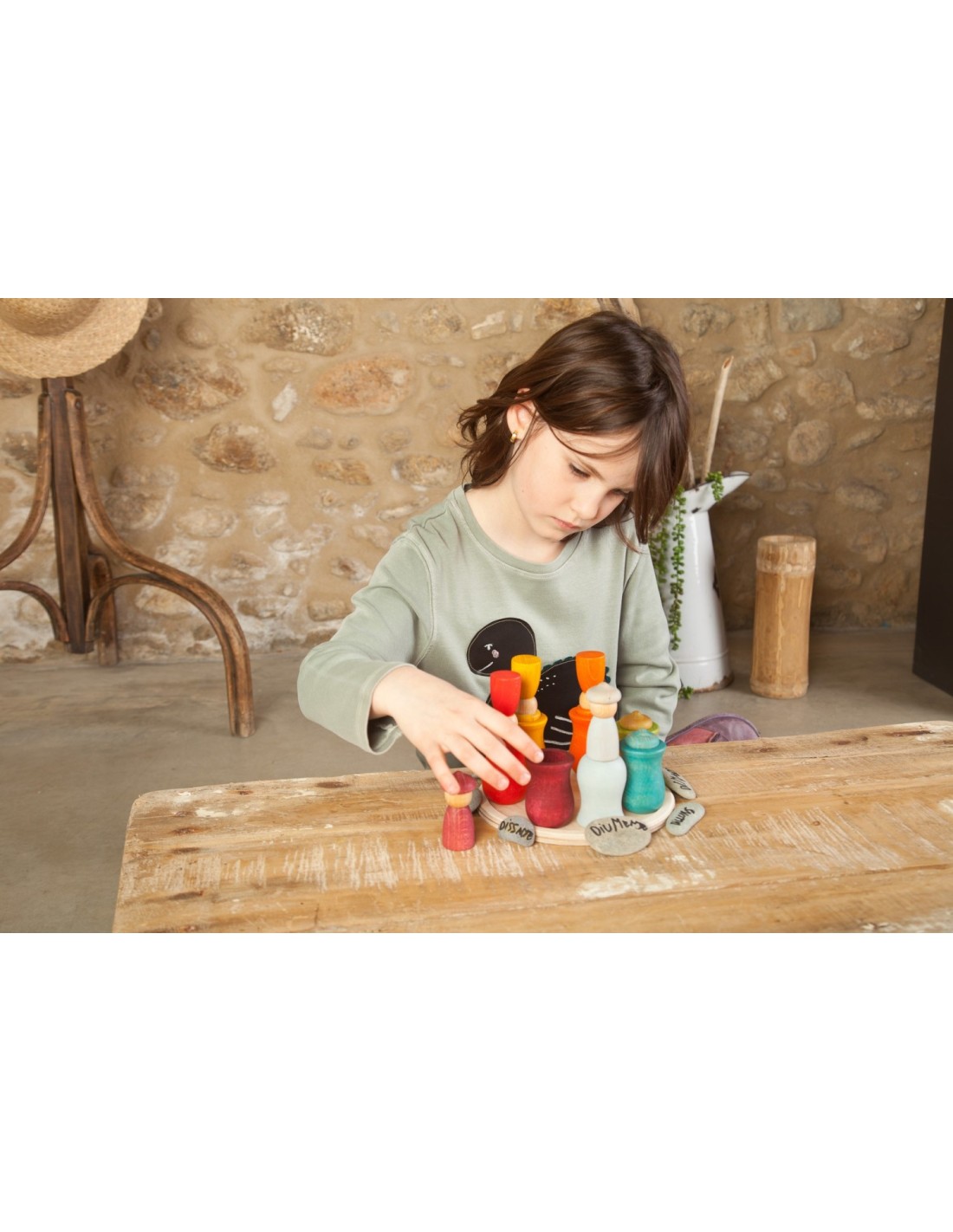 Contiene 7 Nins-bellotas en 7 colores que se asocian a cada día de la semana según la pedagogía Waldorf.