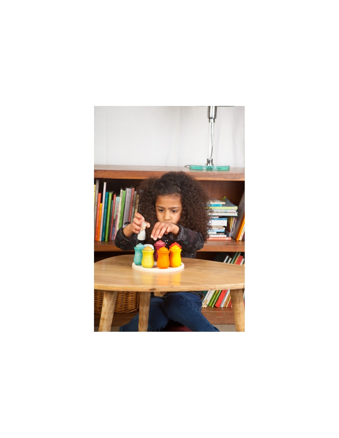 7 vasijas y 1 plato redondo de 18cm ø donde se contienen los elementos. Material para vivir el ritmo cíclico semanal. Los niños asociarán cada día con su color, y así podrán entender el paso de los días. Muchas culturas antiguas creían que cada día de la semana tenía su propio planeta, color, olor y grano. Luego, estas ideas fueron aplicadas por las pedagogías Waldorf. Lunes: luna, arroz, morado o violeta, jazmín. Martes: Marte, rojo, Cebada, clavo. miércoles, mercurio, mijo, amarillo, copal. Jueves, Júpiter, centeno, naranja, cedro… Viernes: Venus, avena, verde, rosa Sábado: Saturno, maíz, índigo o azul, mirra. Domingo: sol, trigo, blanco, incienso